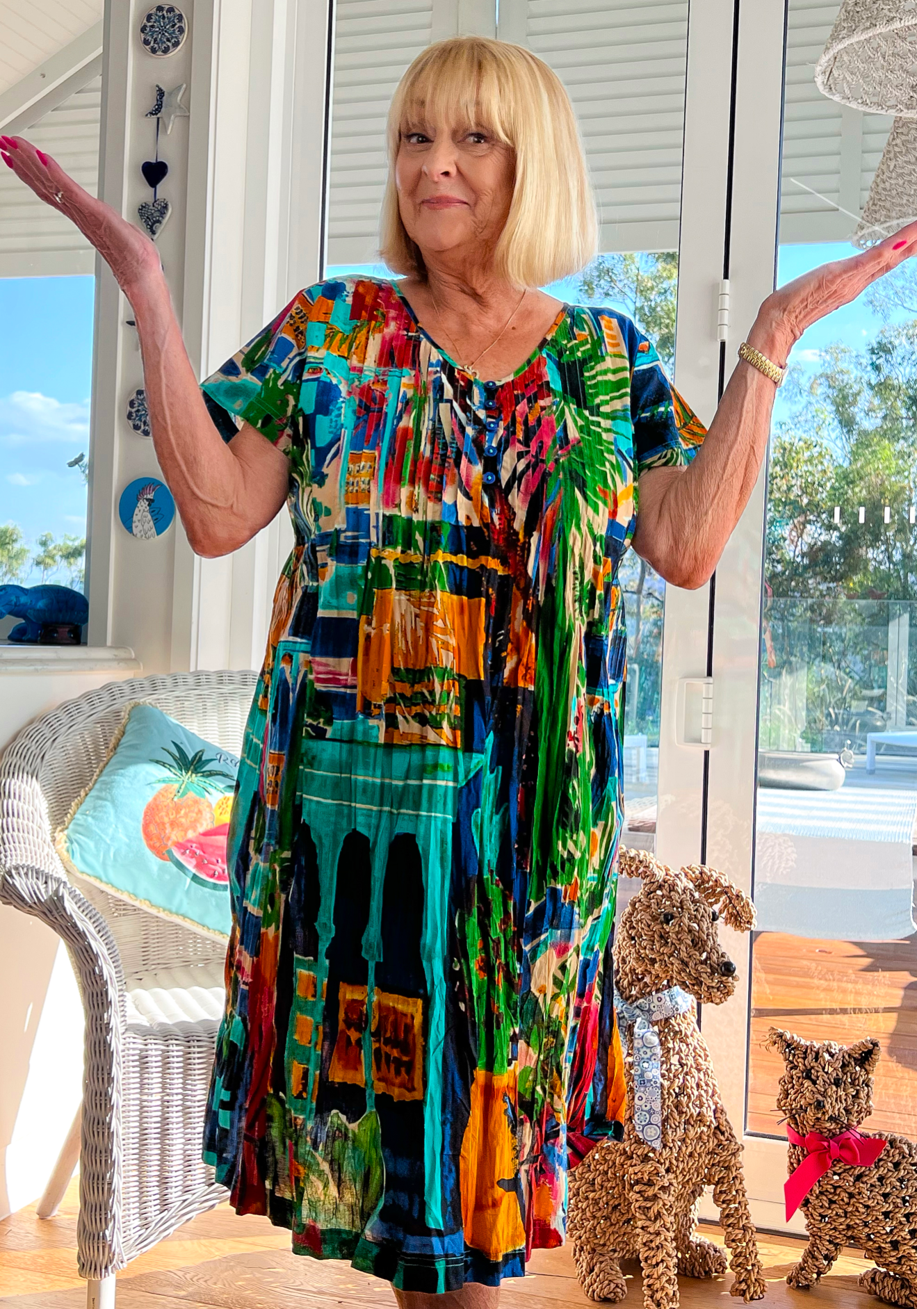 This is my third crinkle cotton easy fit dress. I love the eclectic colours and how cool and comfortable they are to wear. A bonus for menopausal women. People always comments on how lovely the dress is and I am super happy to share the brand and where I buy them. The colours hold for a long time which is also a bonus. They are very easy to launder and the quick dry fabric makes them perfect for travelling. Can you tell I just love them?!!