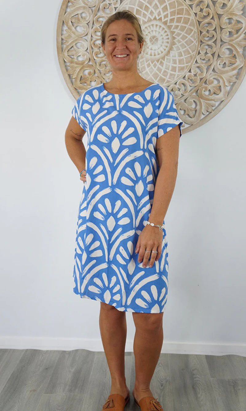 I love this dress. The colours are so bright against the calming of the blue. It fits perfectly and the collar adds style to this comfortable summer cotton dress, with its swinging hemline.