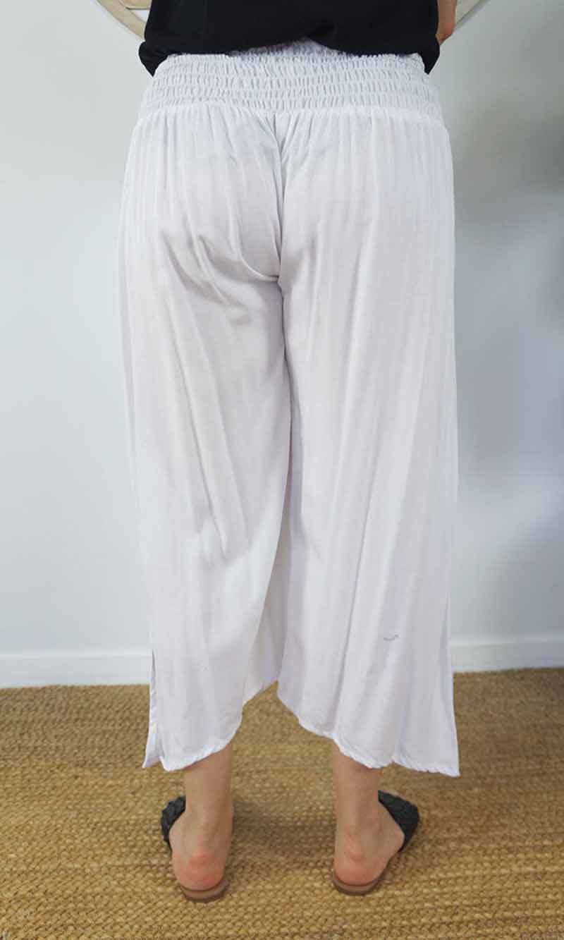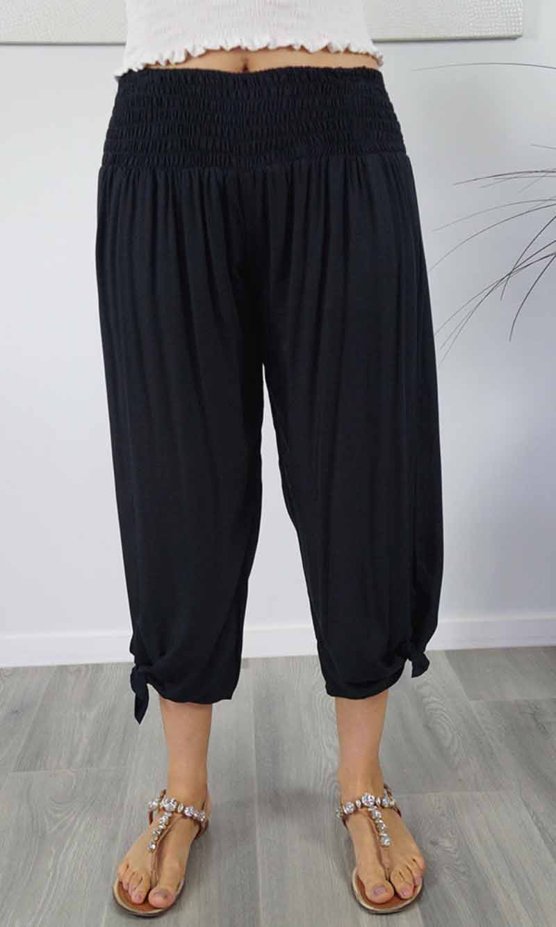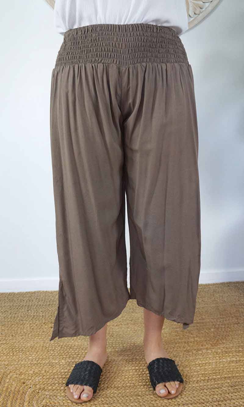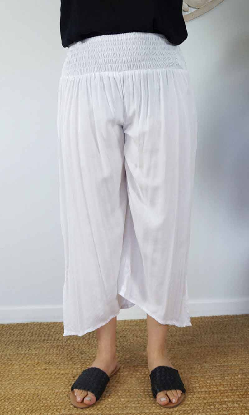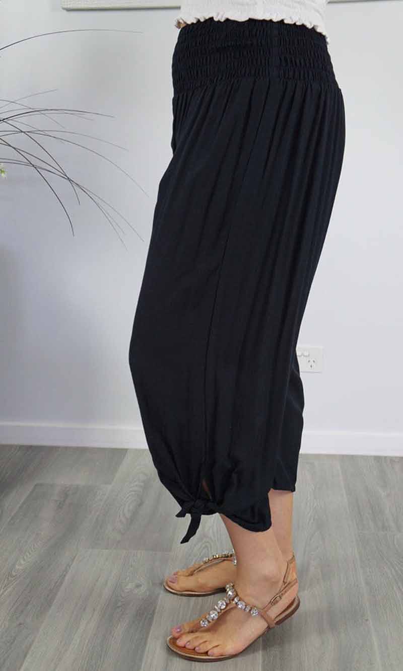 The 3/4 Bazzar pant is a free size garment, fits between size 10-16. This product will give you comfort for an everyday day wear with an elastic waist, wide leg, splits and ties for that classic look. (Can be worn tied or untied at the leg)