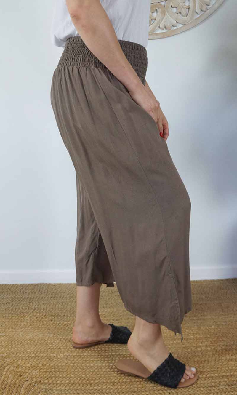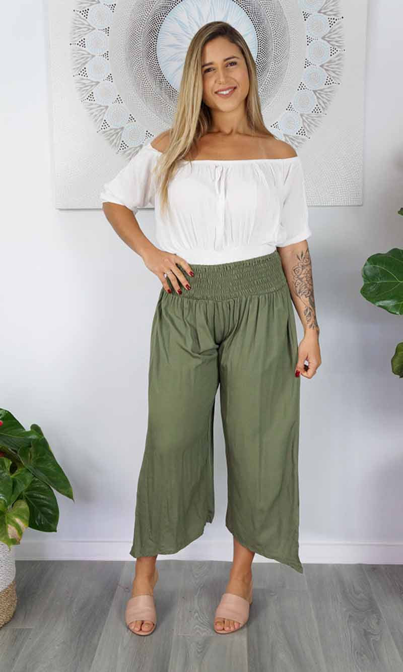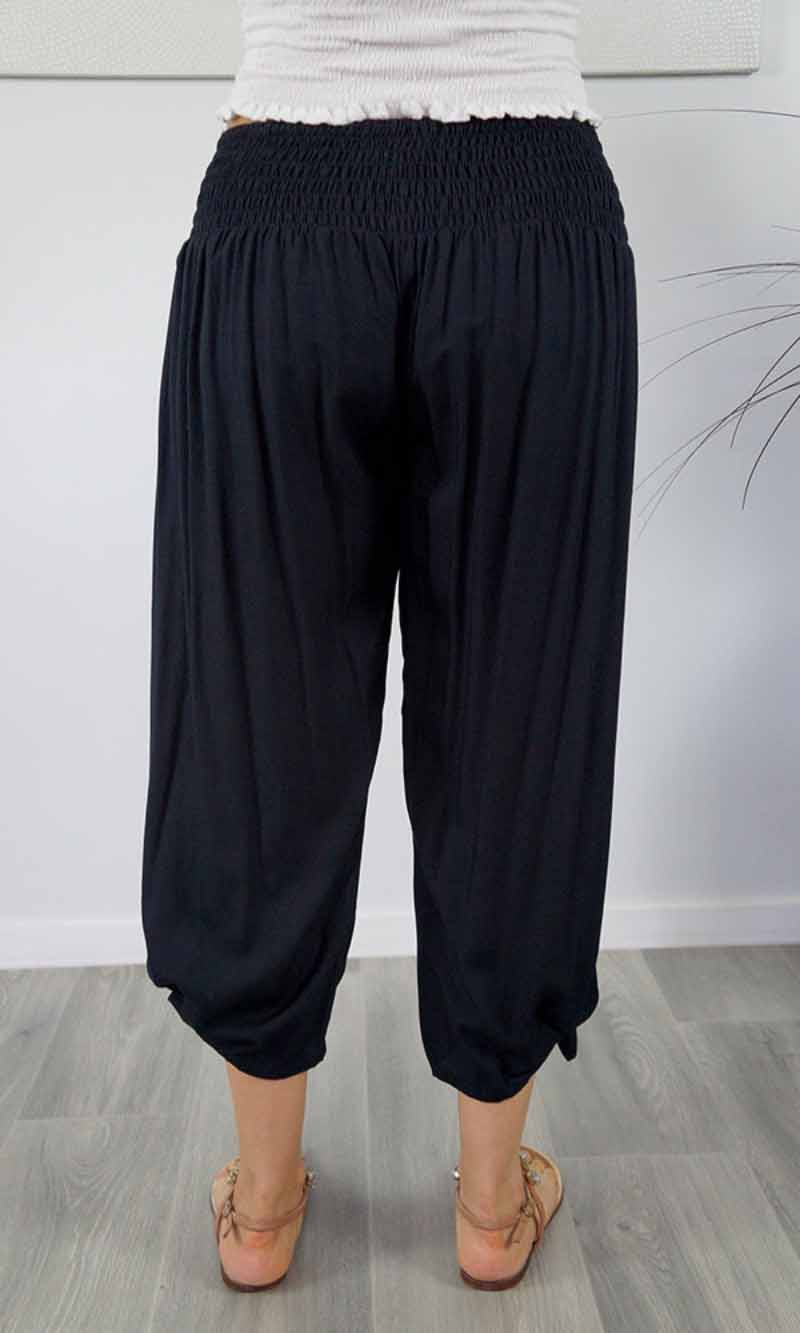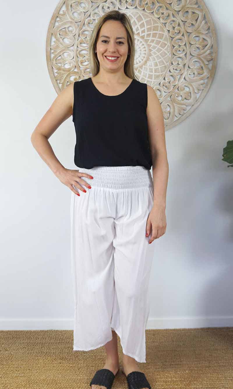 The 3/4 Bazzar pant is a free size garment, fits between size 10-16. This product will give you comfort for an everyday day wear with an elastic waist, wide leg, splits and ties for that classic look. (Can be worn tied or untied at the leg)