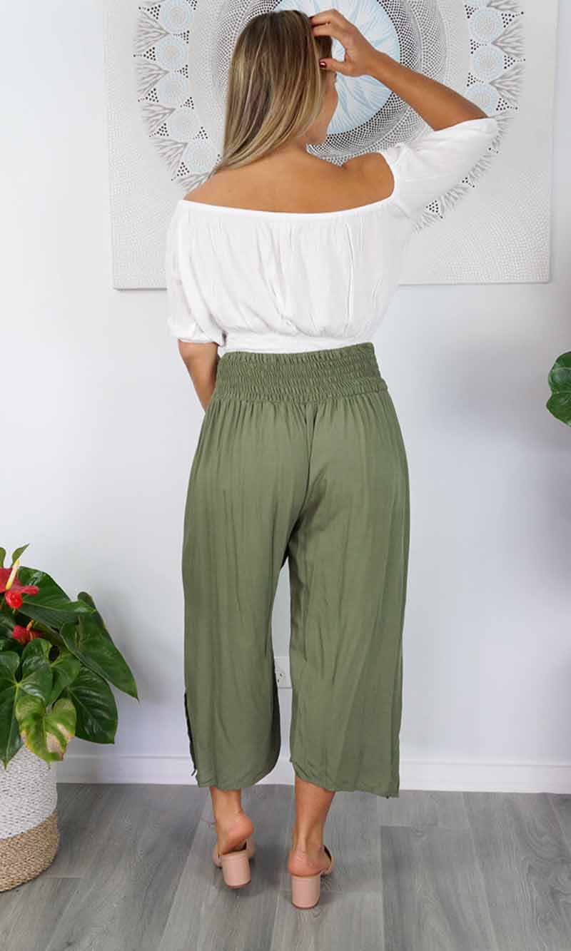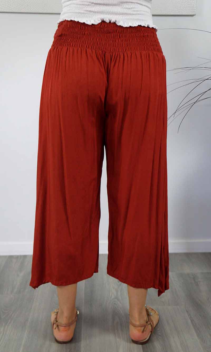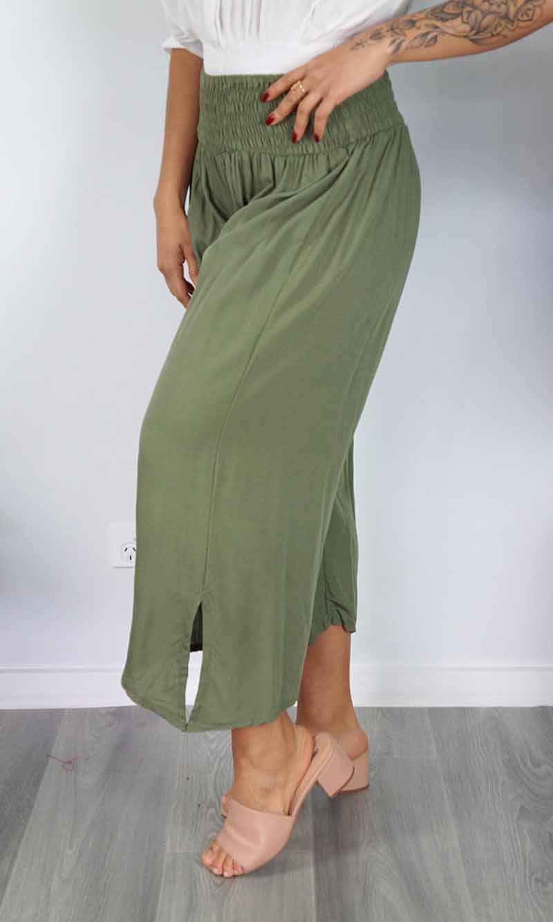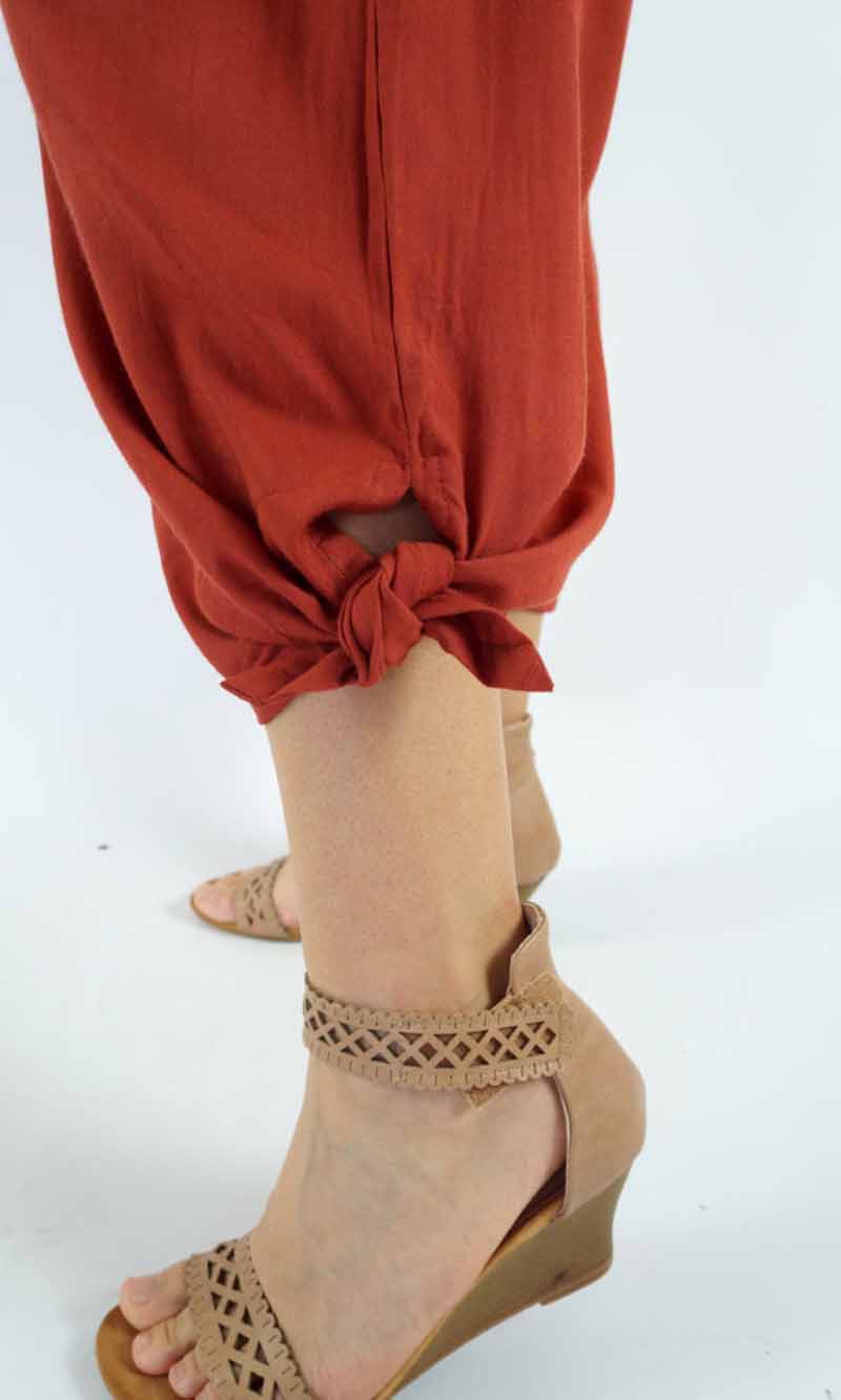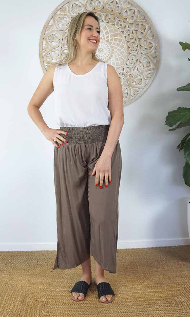 The 3/4 Bazzar pant is a free size garment, fits between size 10-16. This product will give you comfort for an everyday day wear with an elastic waist, wide leg, splits and ties for that classic look. (Can be worn tied or untied at the leg)