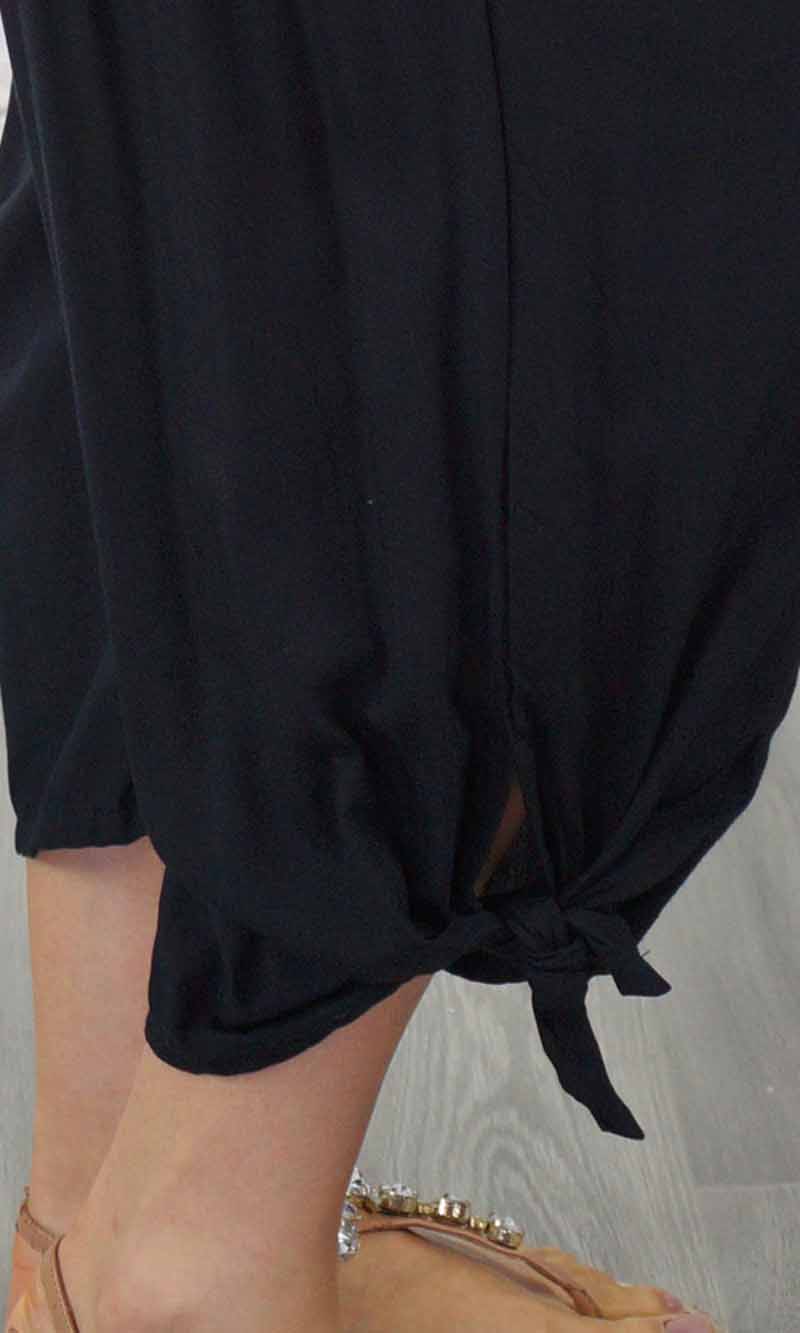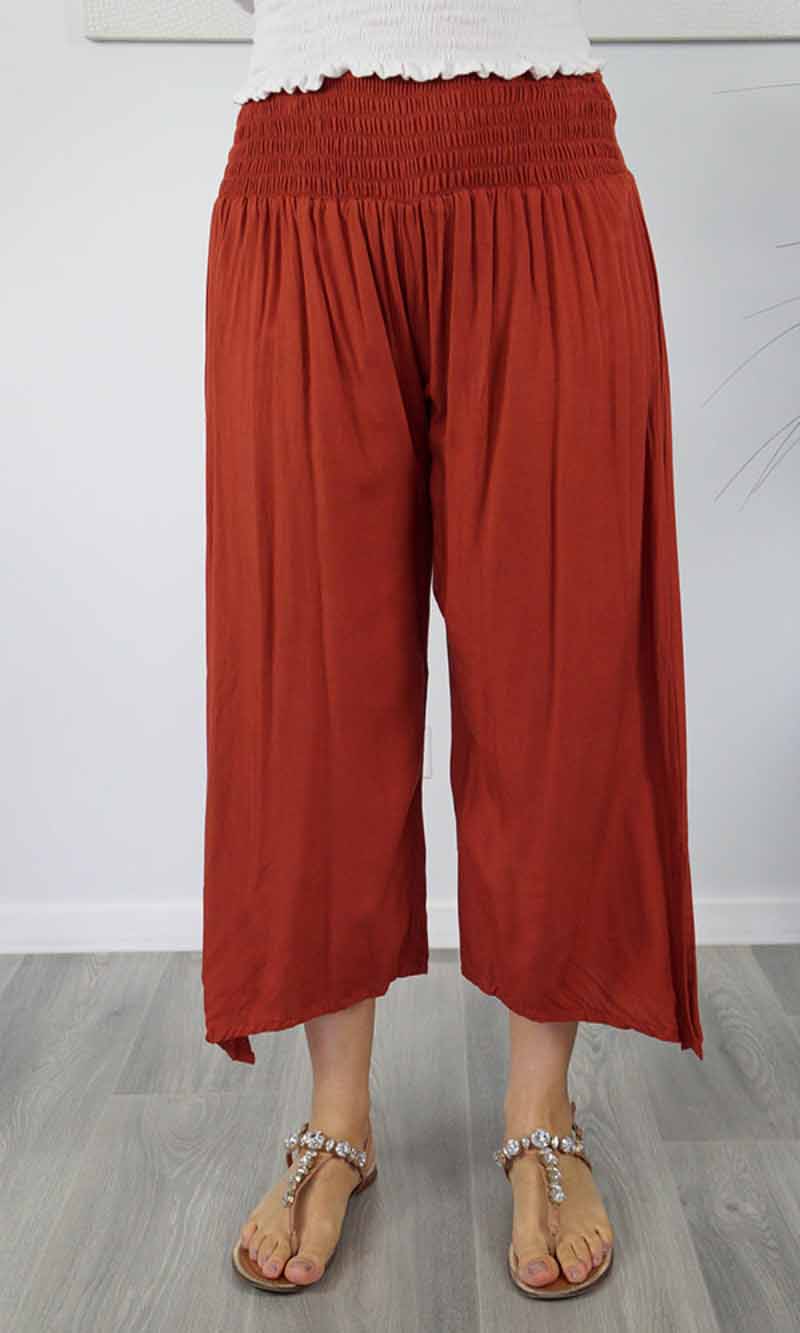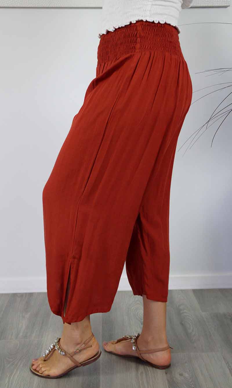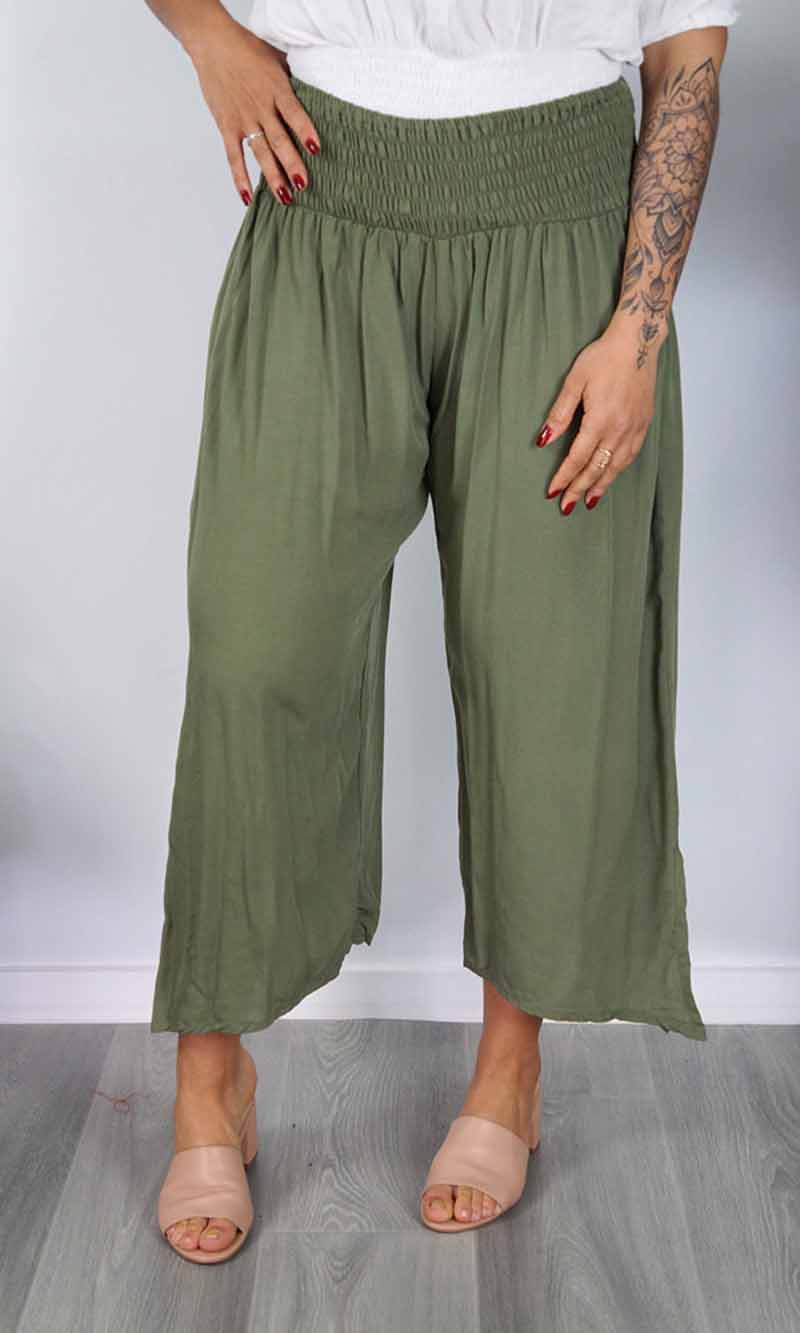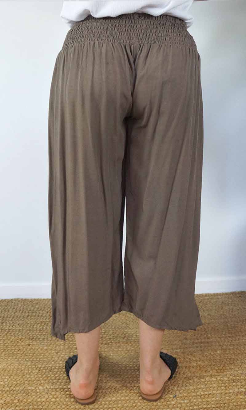 The 3/4 Bazzar pant is a free size garment, fits between size 10-16. This product will give you comfort for an everyday day wear with an elastic waist, wide leg, splits and ties for that classic look. (Can be worn tied or untied at the leg)