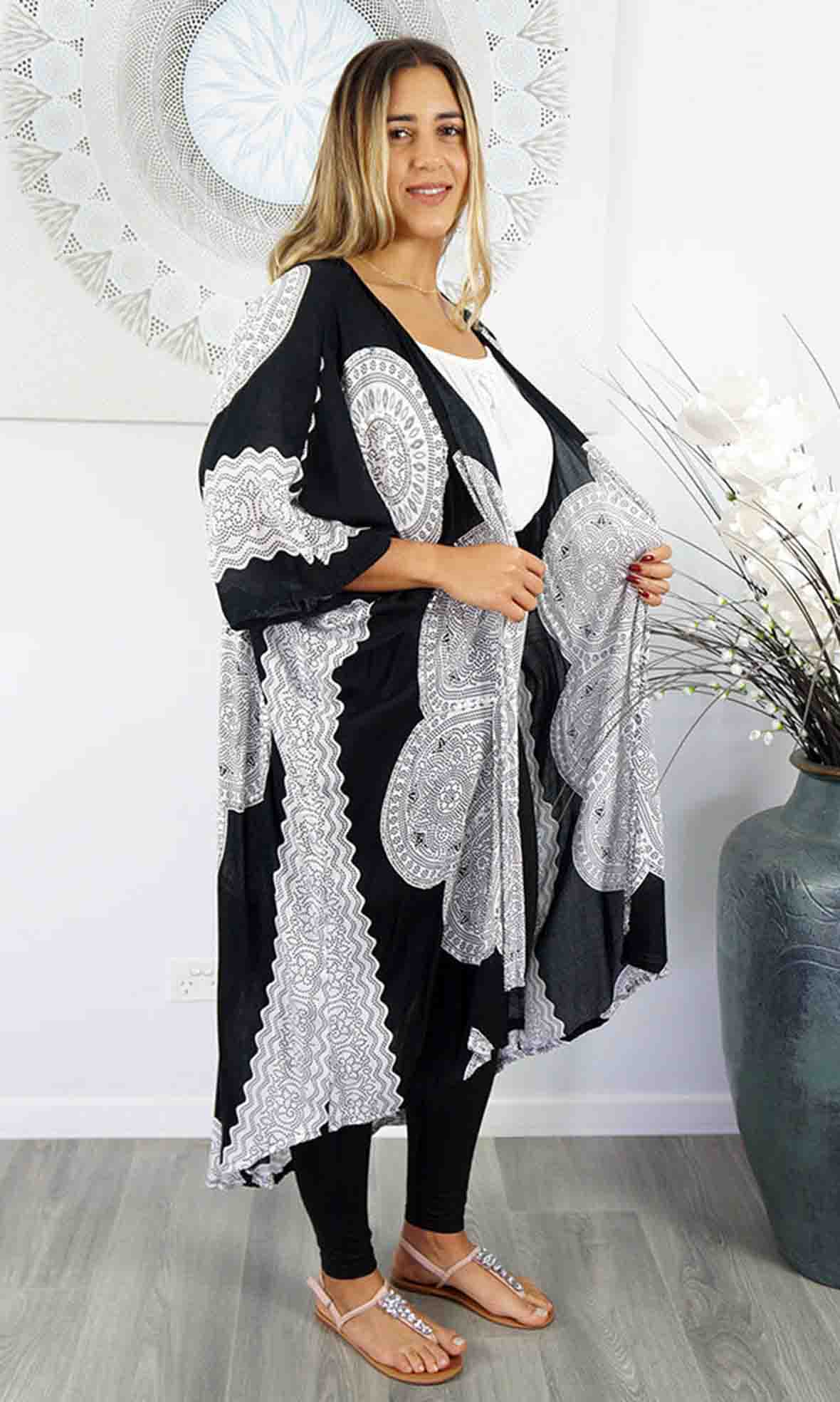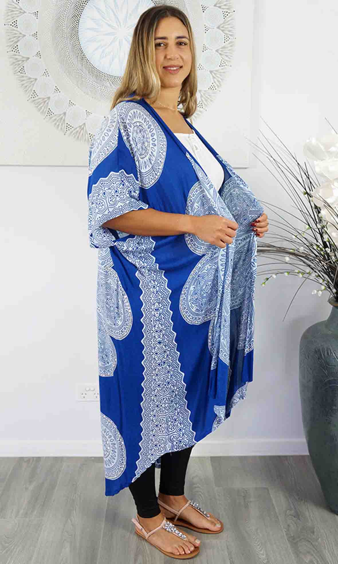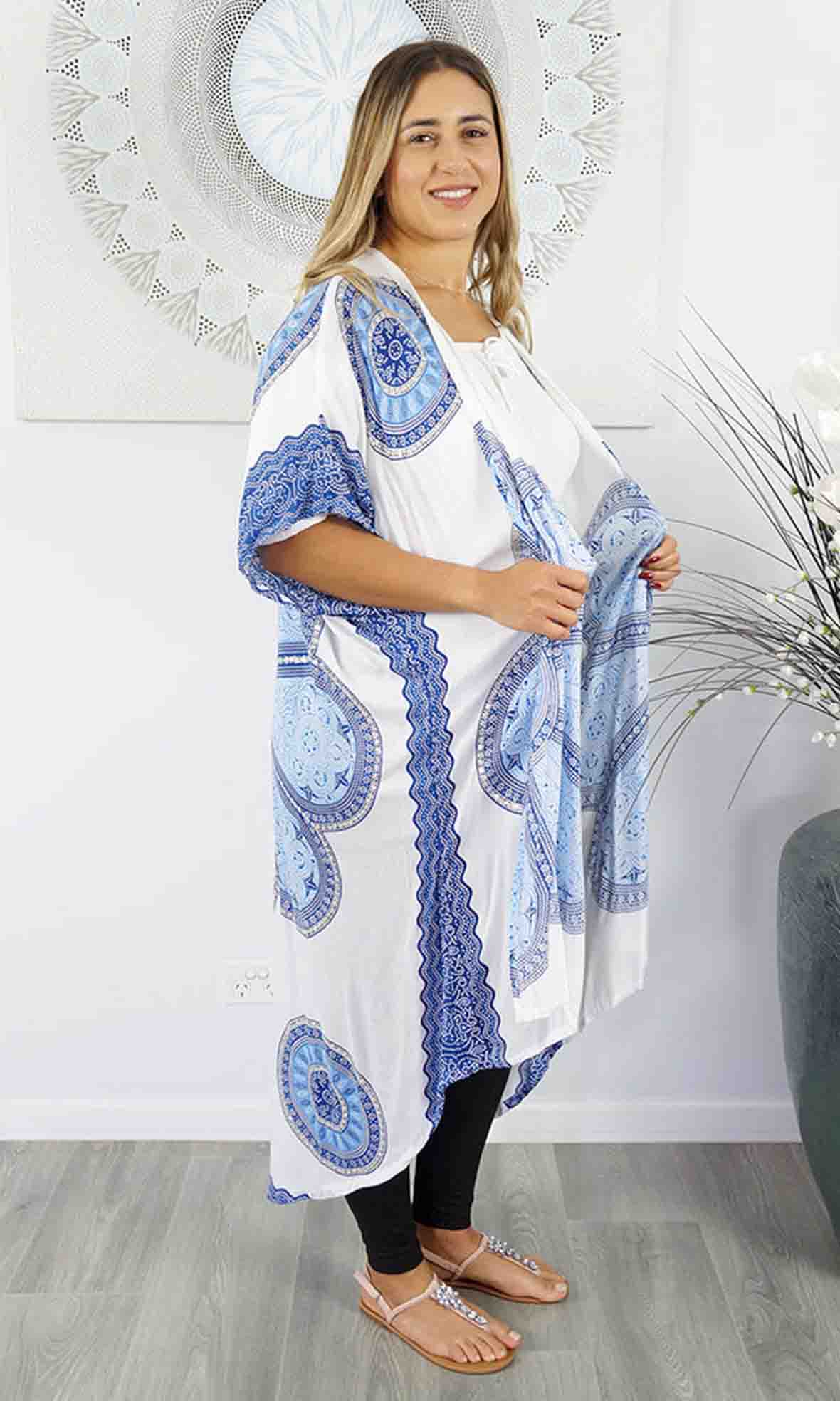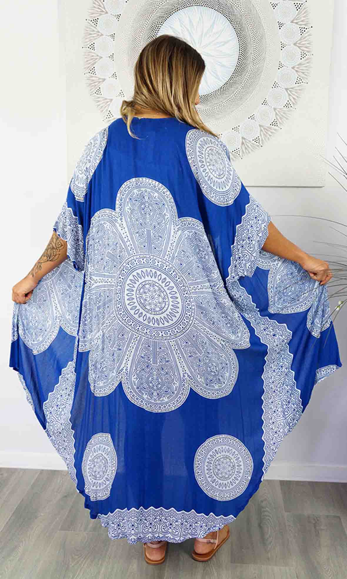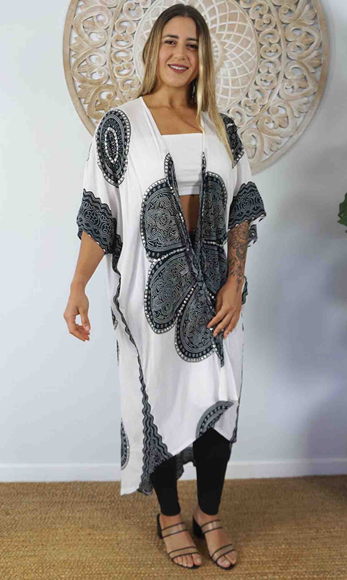 A comfortable way of getting aboutl or on the beach, this all rayon and sequined cape suitable for sizes 10 to 18. Finished length on the back s approximately 120cm, and 90cm on the front.