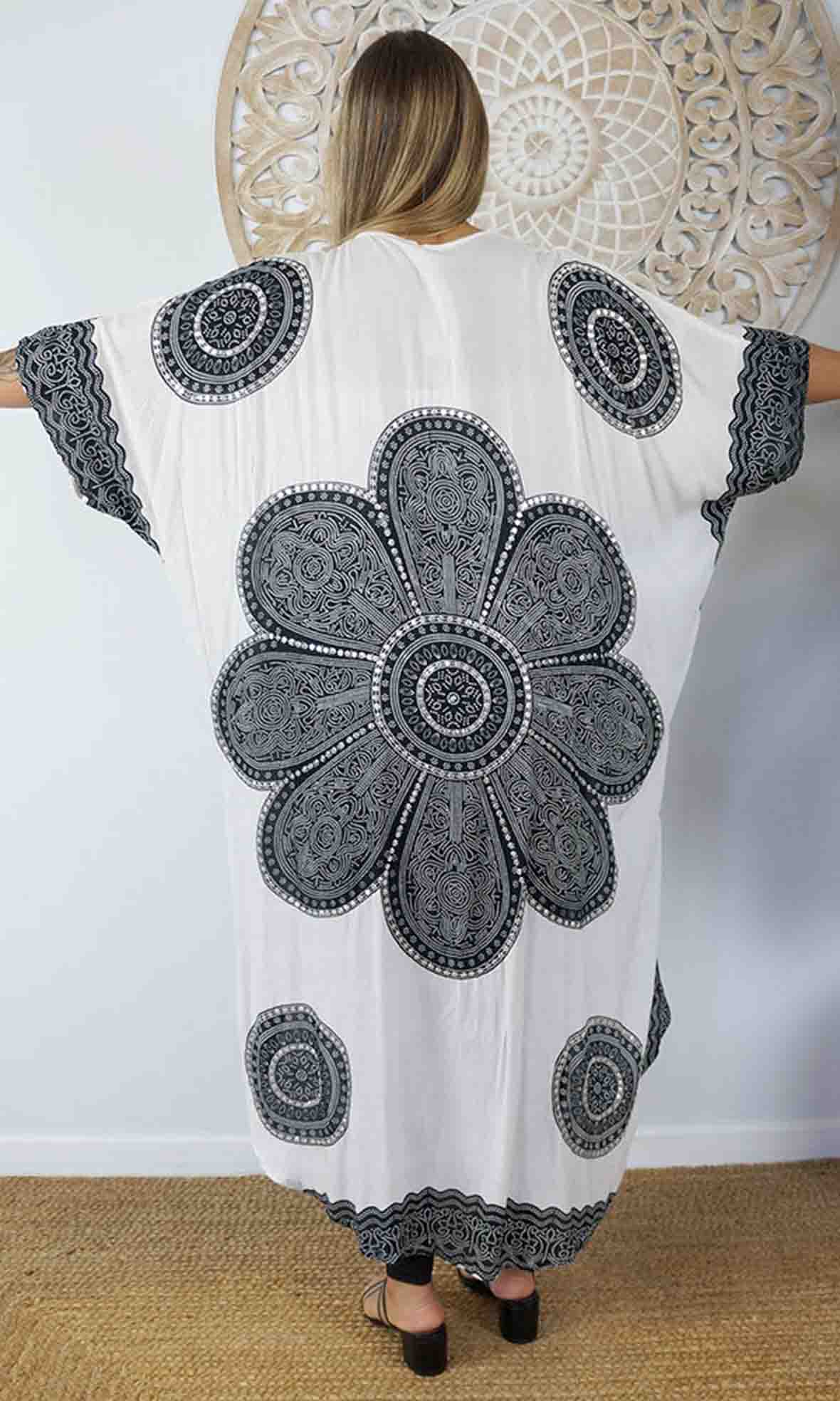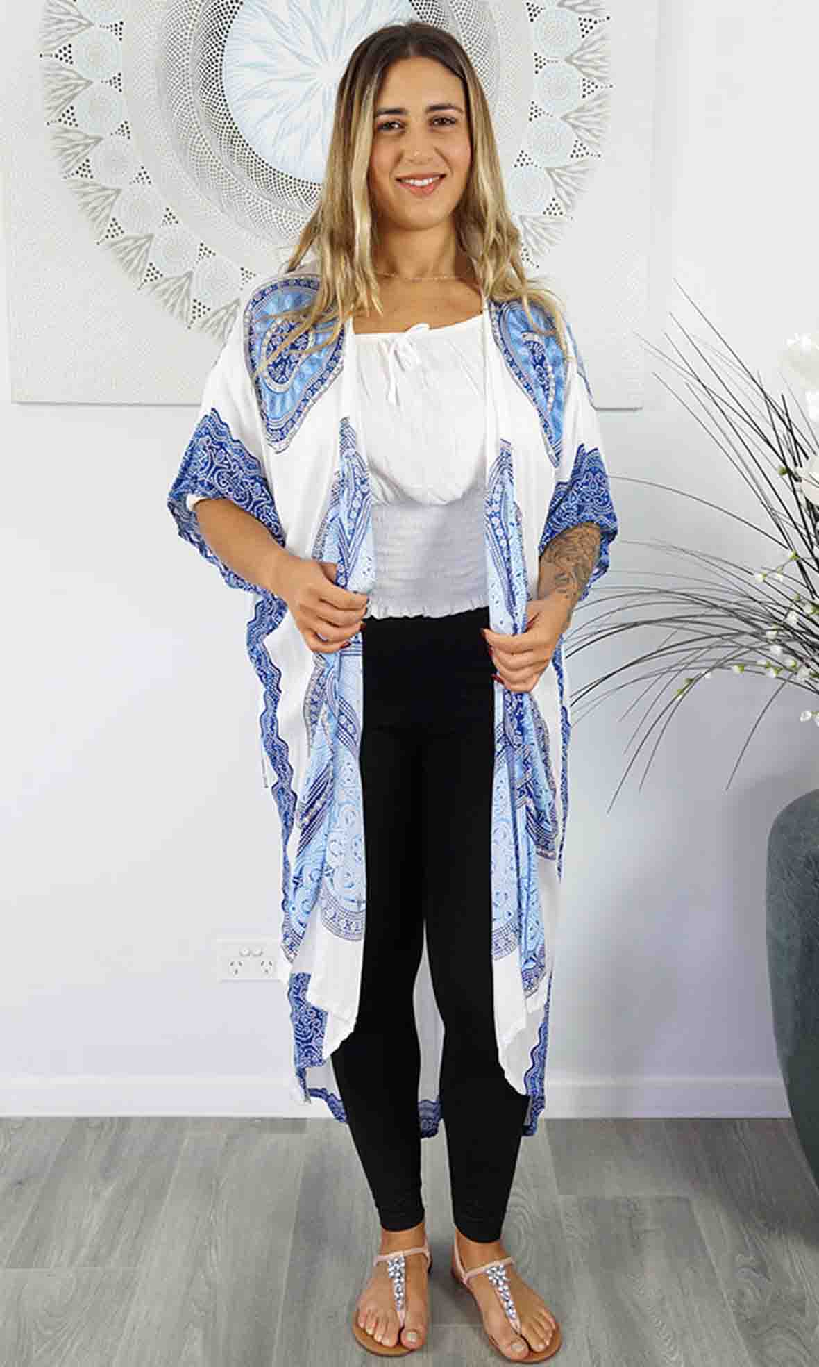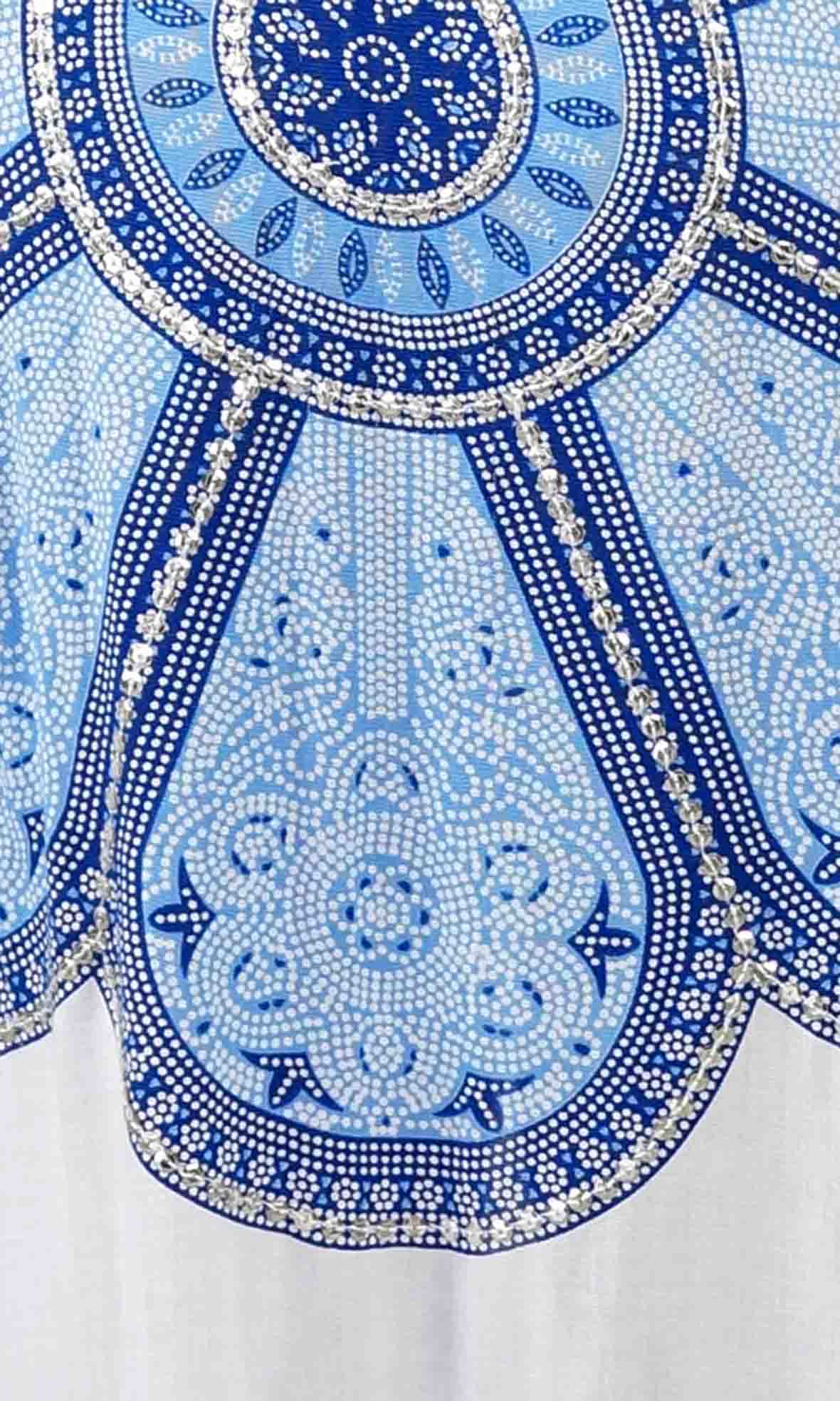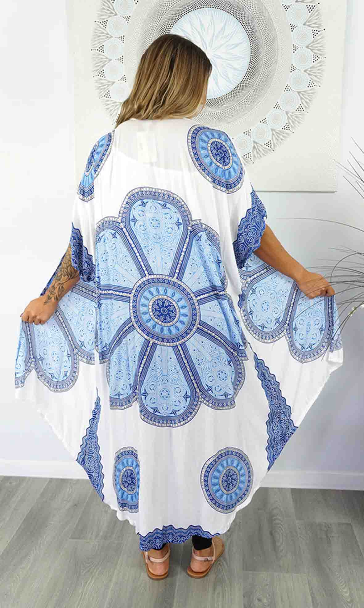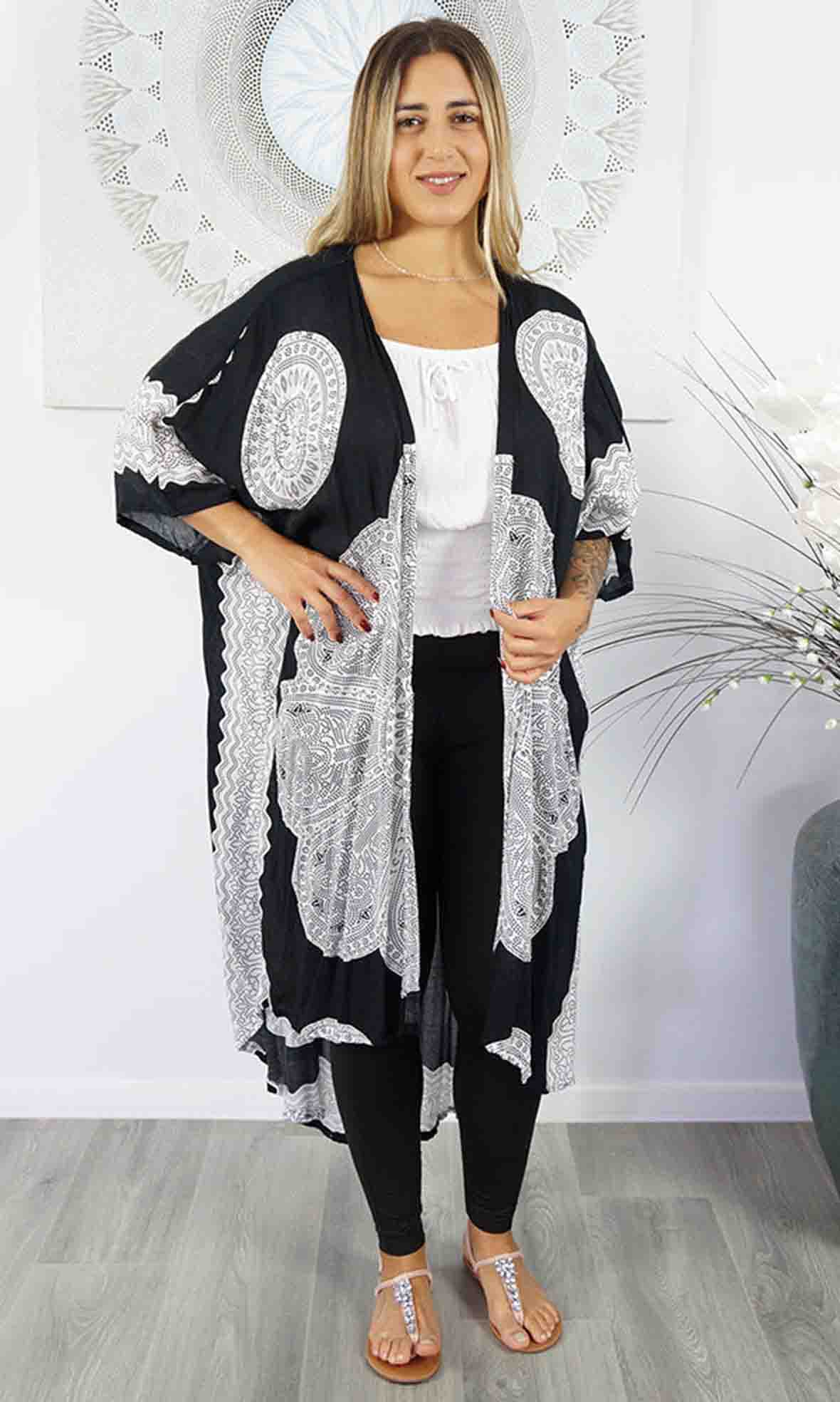 A comfortable way of getting aboutl or on the beach, this all rayon and sequined cape suitable for sizes 10 to 18. Finished length on the back s approximately 120cm, and 90cm on the front.