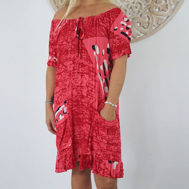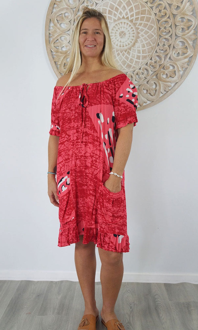 Made from crinkle rayon, the cuba dress features elastic around the back neck line with a drawstring tie at the front, frill detail on sleeves and hem line with pockets on each side.
