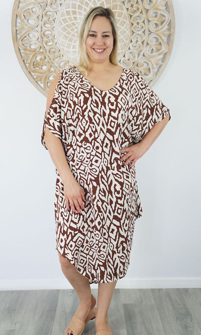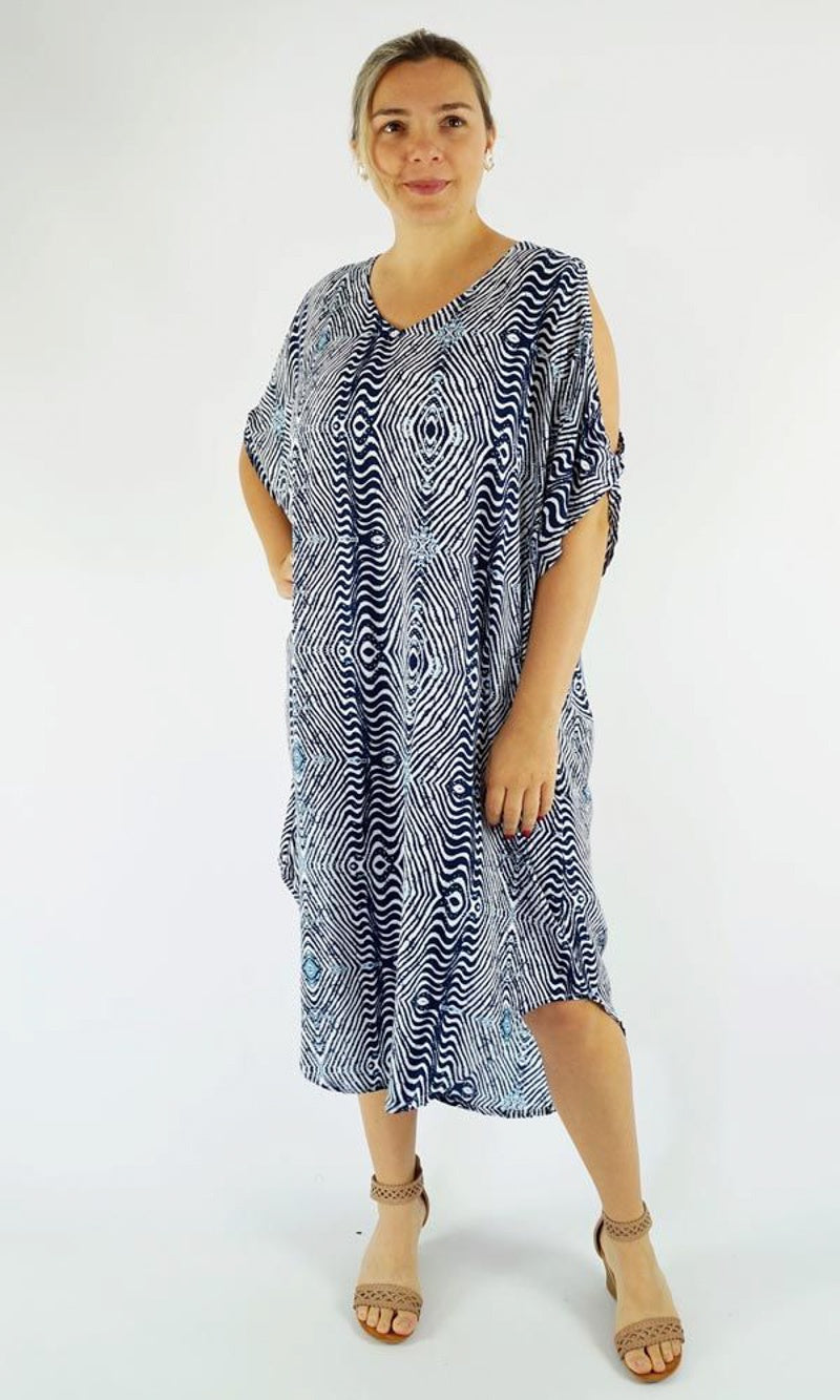 A simple but comfortable day dress. This rayon garment features a V-neck line, split capped sleeves, curved bottom hem and an adjustable tie across the back of the neck. ONE SIZE TO FIT 10-16