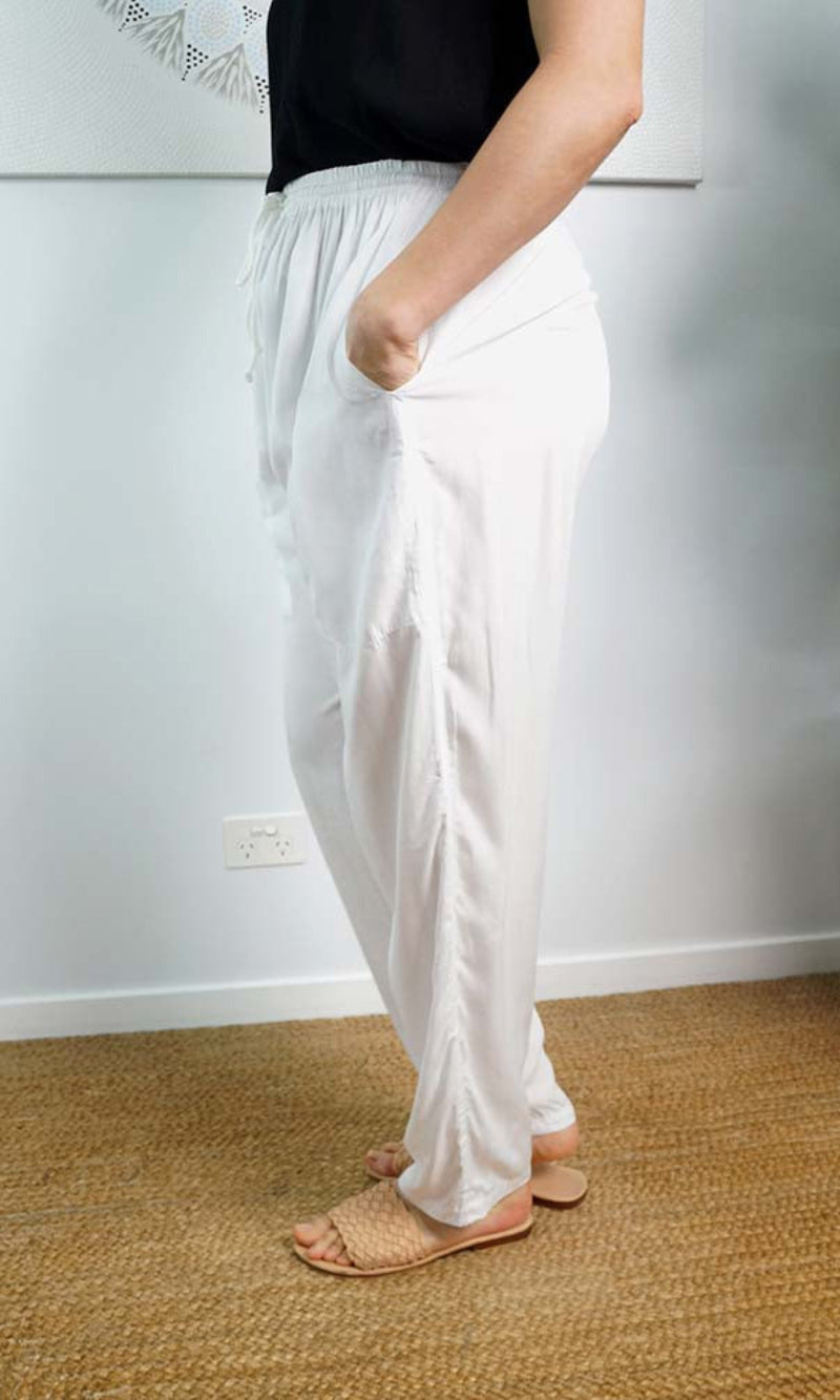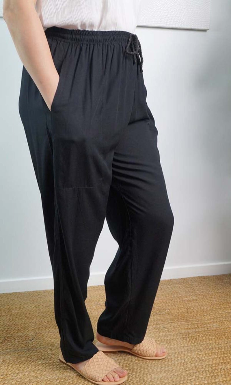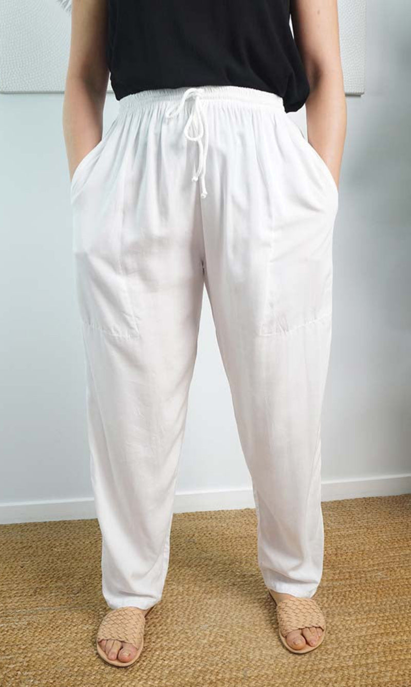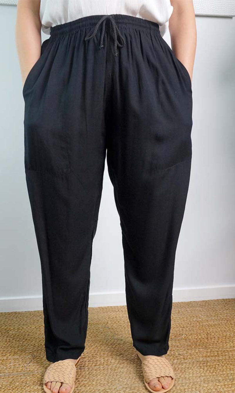 The Happy pant is 100% rayon and 100% comfort, with elastic and tie up cord around the waist and also has side pockets.