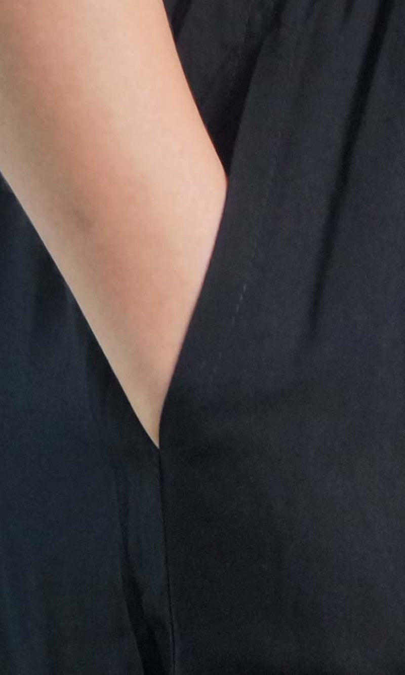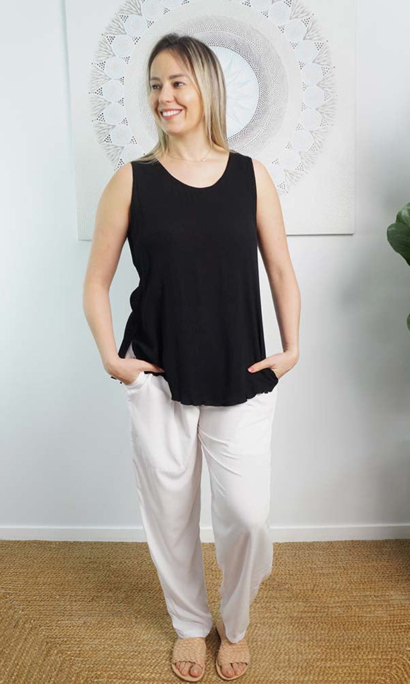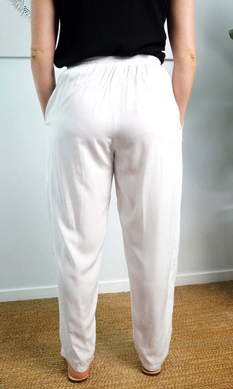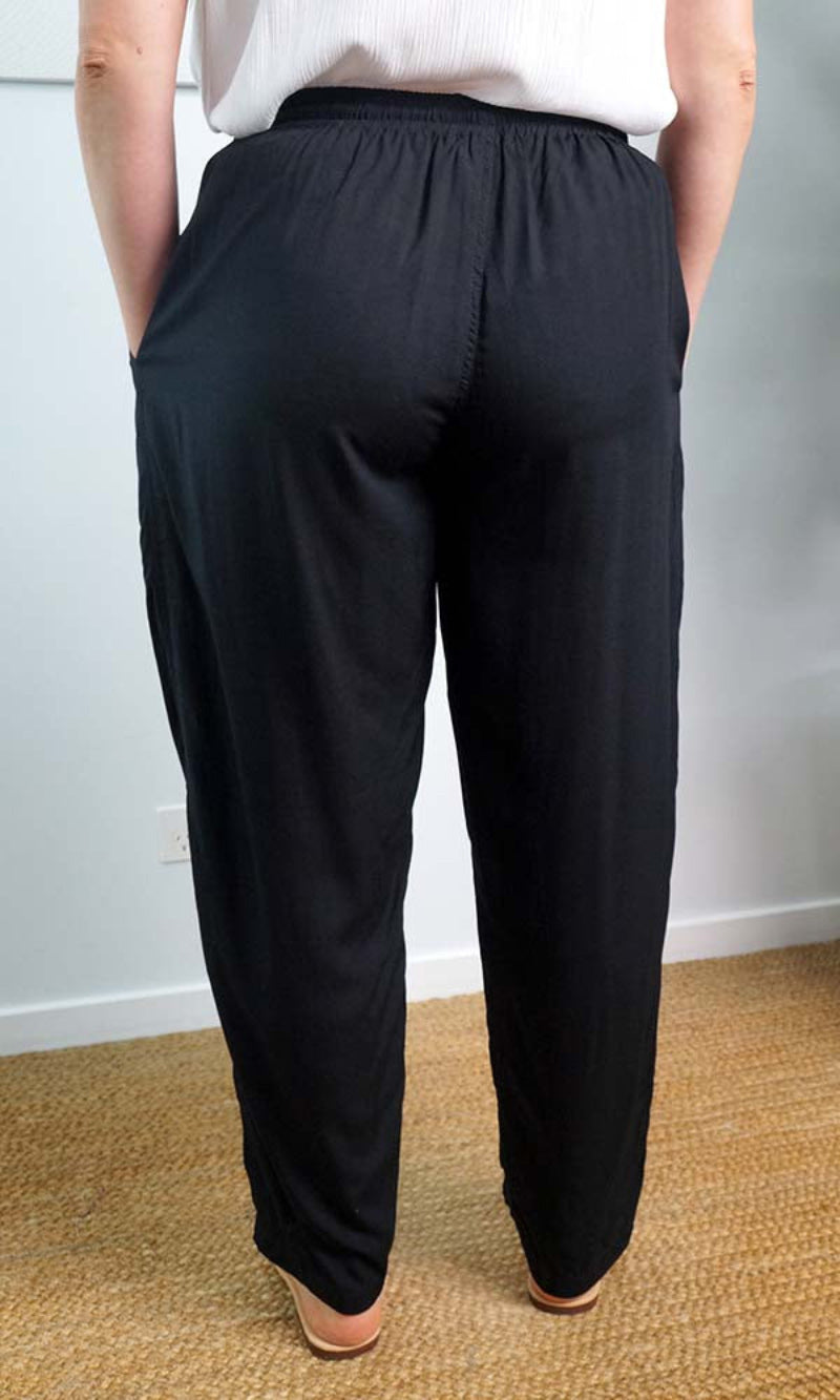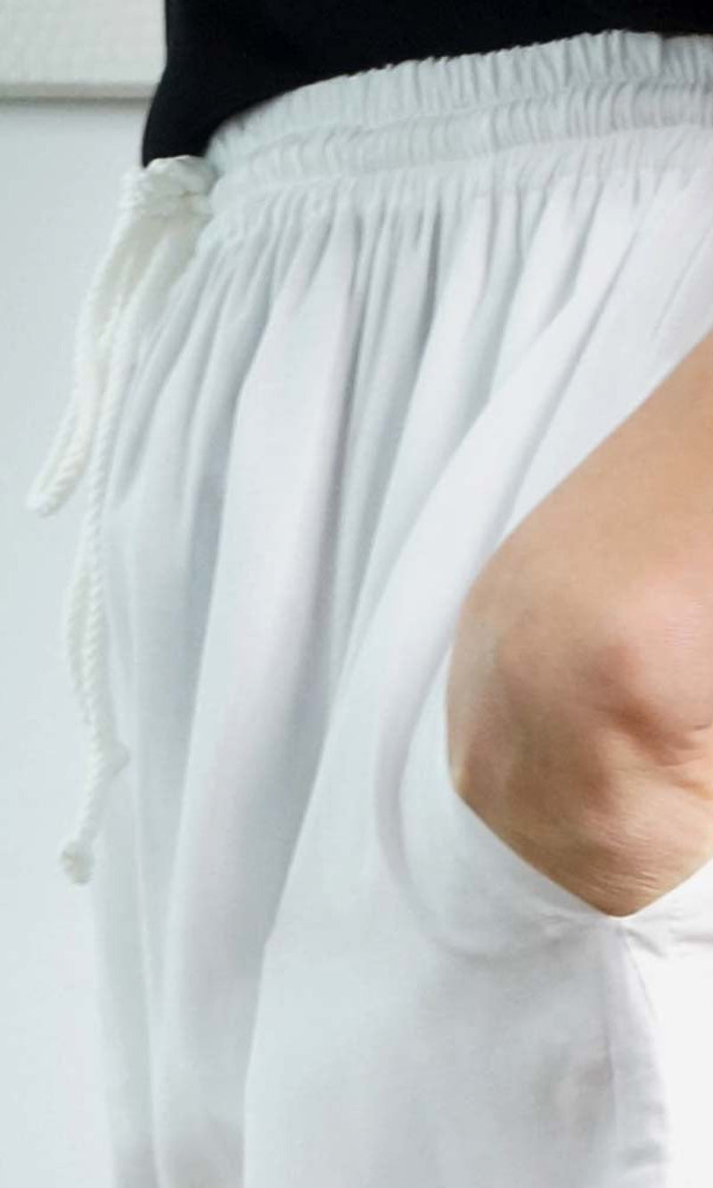 The Happy pant is 100% rayon and 100% comfort, with elastic and tie up cord around the waist and also has side pockets.