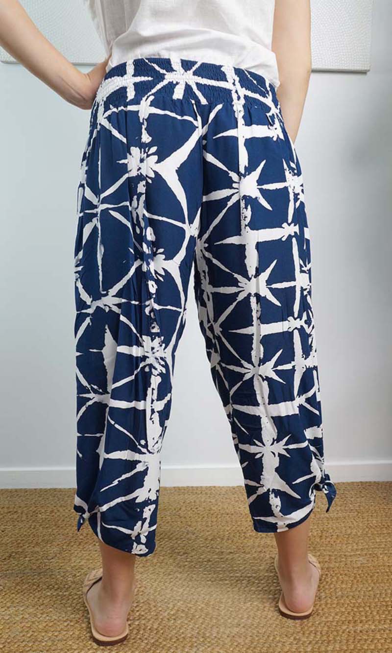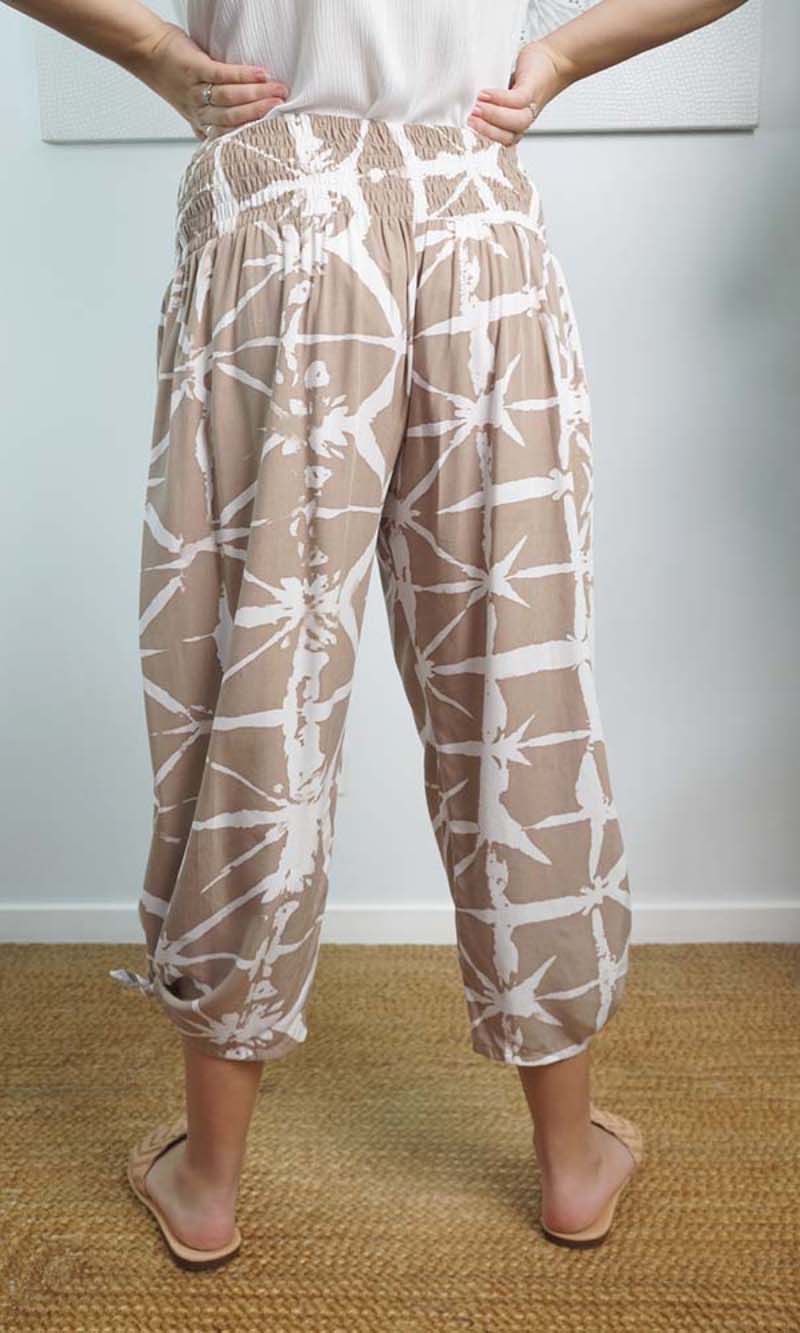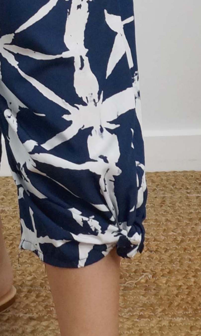 The 3/4 Bazzar pant is a free size garment, fits between size 10-16. This product will give you comfort for an everyday day wear with an elastic waist, wide leg, splits and ties for that classic look. (Can be worn tied or untied at the leg)
