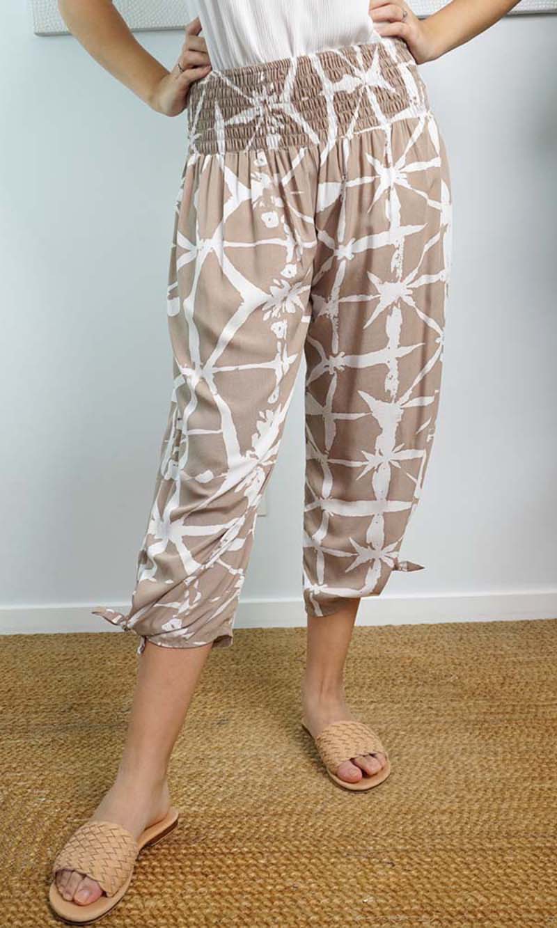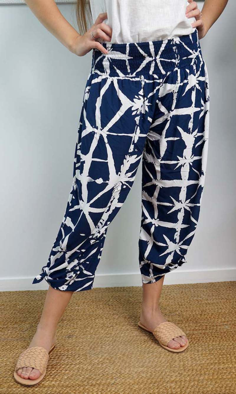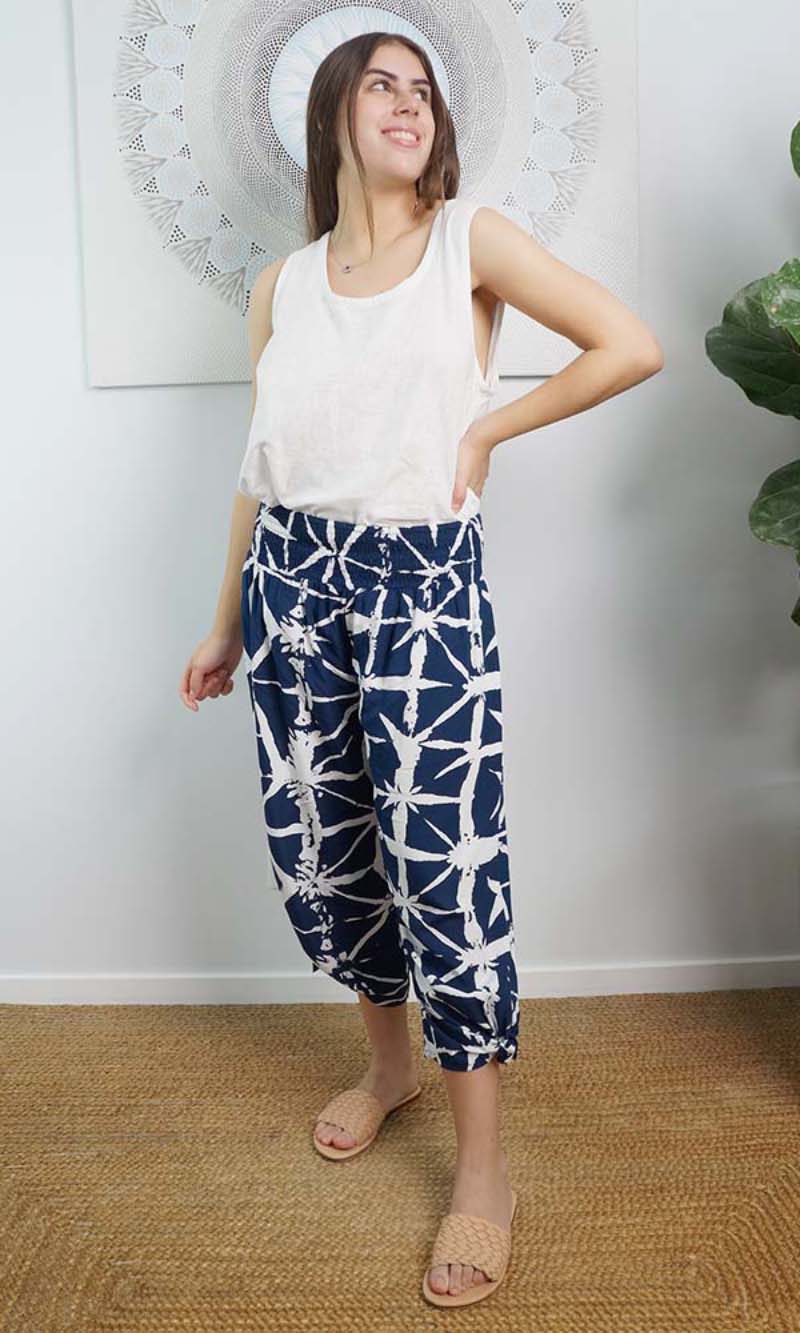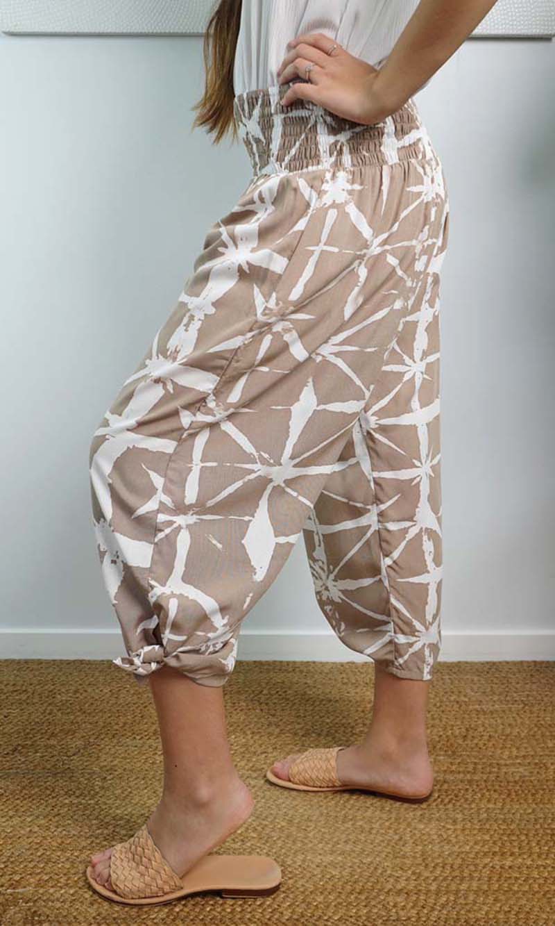 The 3/4 Bazzar pant is a free size garment, fits between size 10-16. This product will give you comfort for an everyday day wear with an elastic waist, wide leg, splits and ties for that classic look. (Can be worn tied or untied at the leg)