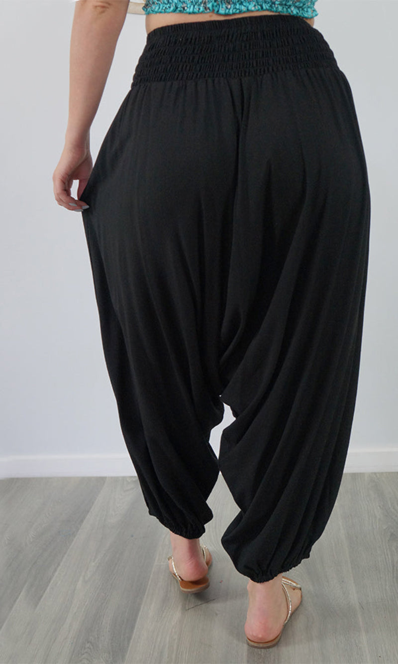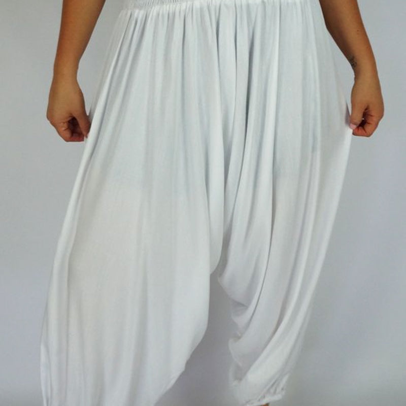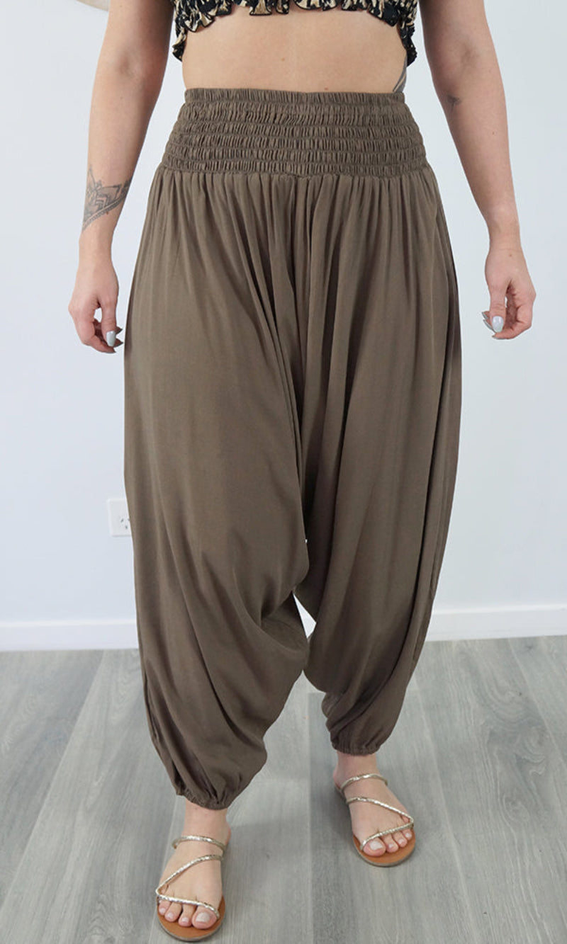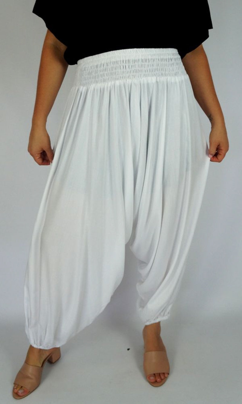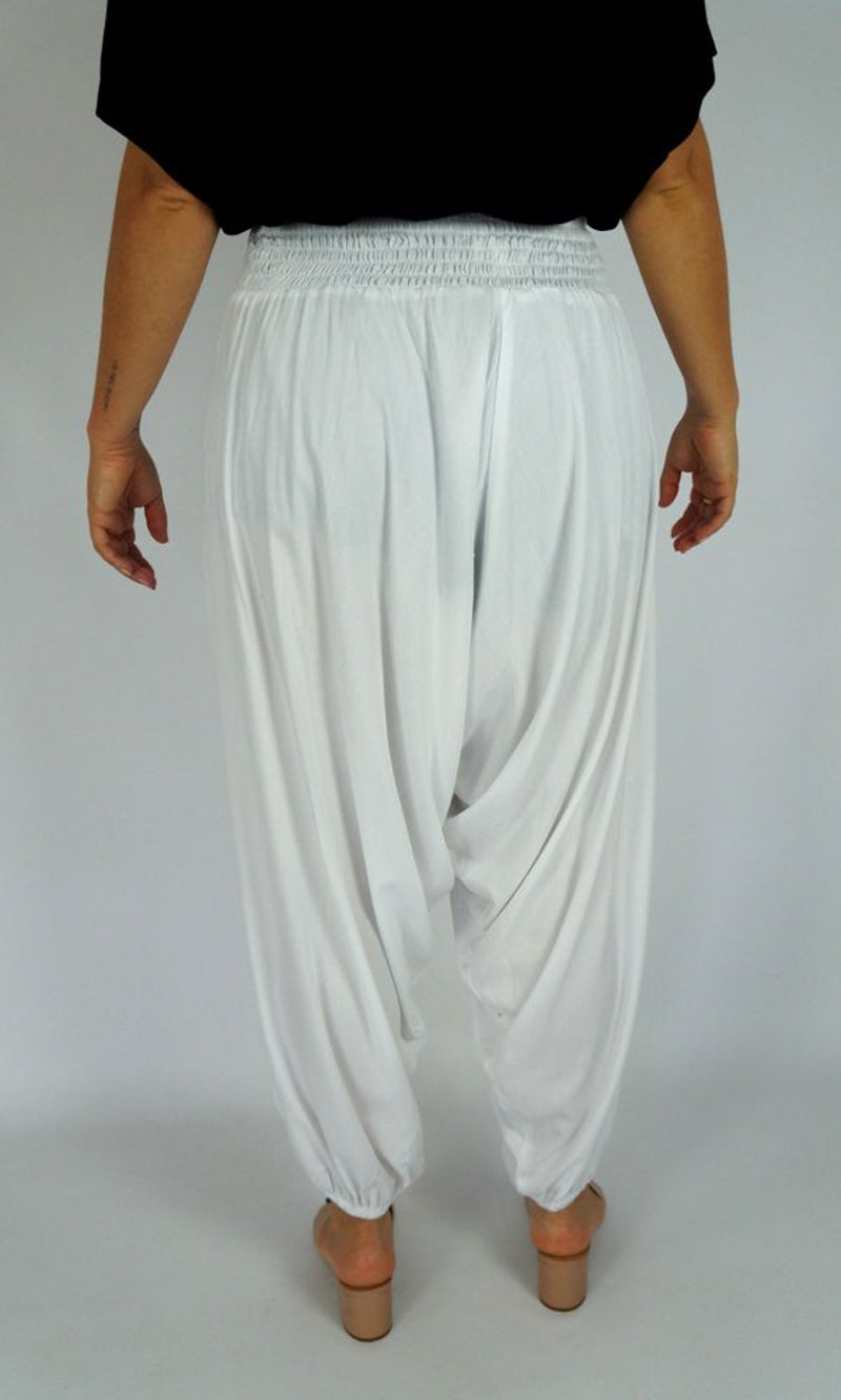 With an elastic shirring waist, low dropping crotch seam and elastic around the ankle this pant is truly comfort for everyday wear. ONE SIZE TO FIT 10-16