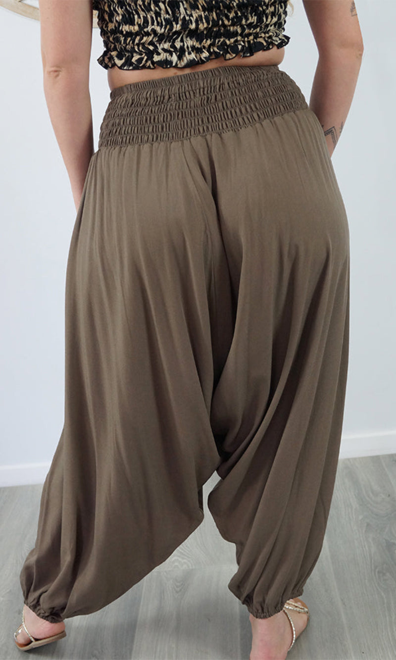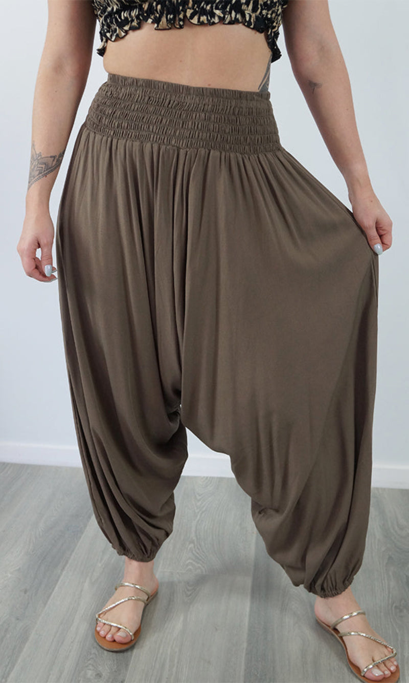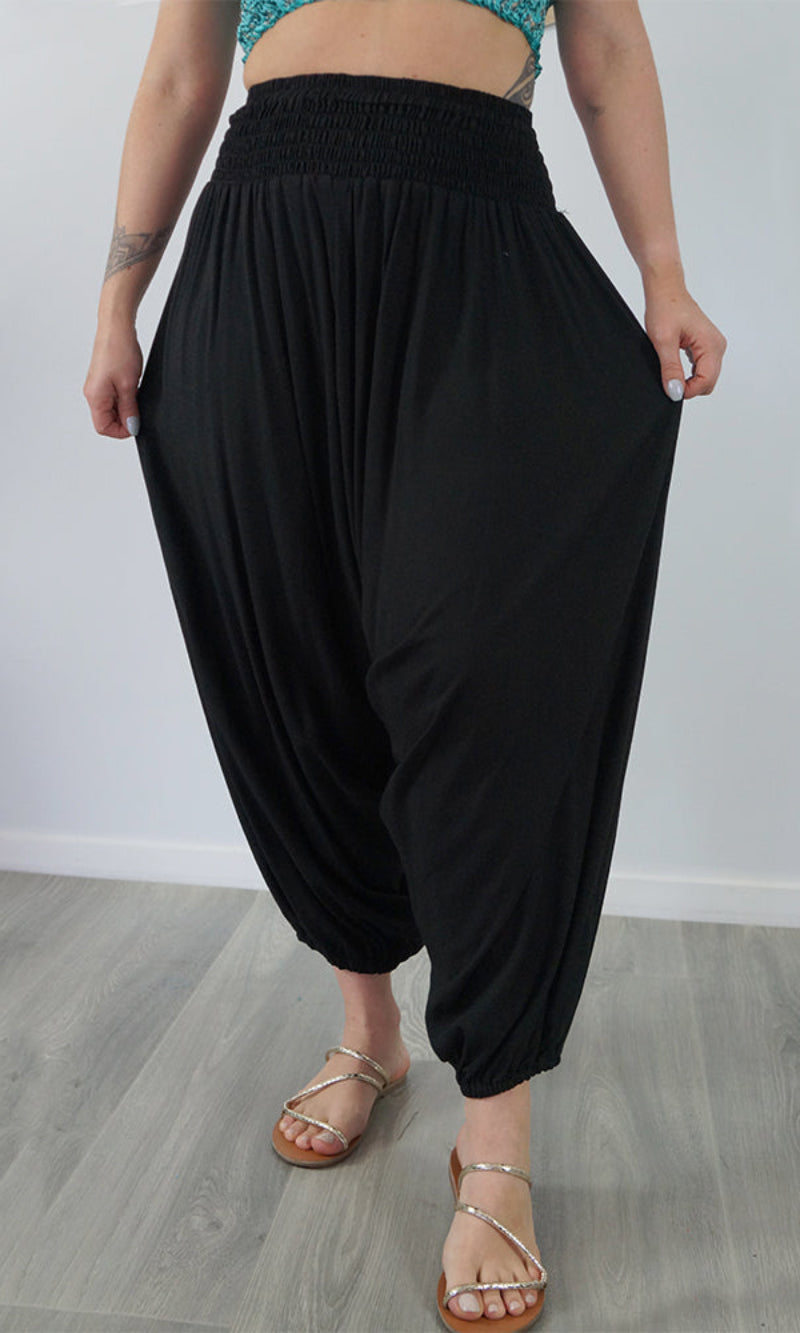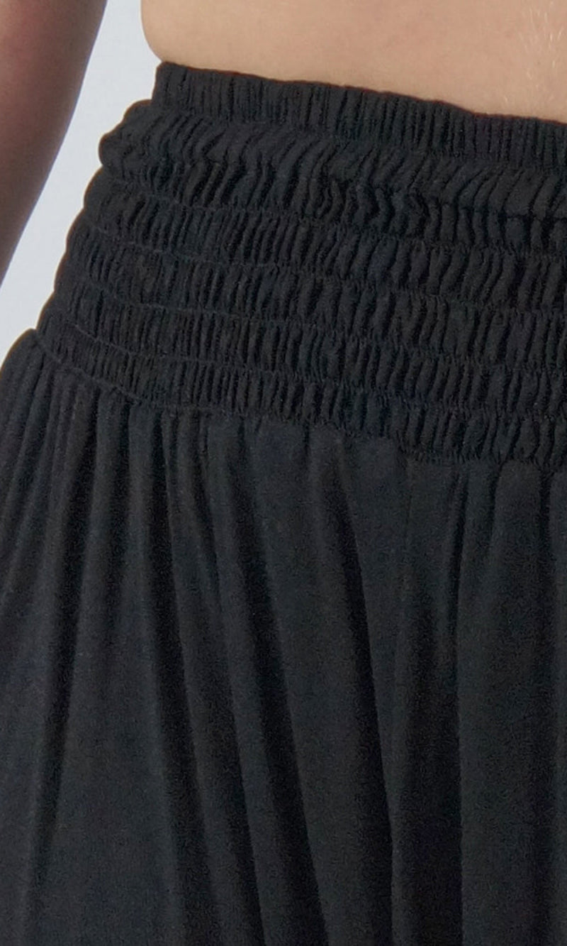 With an elastic shirring waist, low dropping crotch seam and elastic around the ankle this pant is truly comfort for everyday wear. ONE SIZE TO FIT 10-16