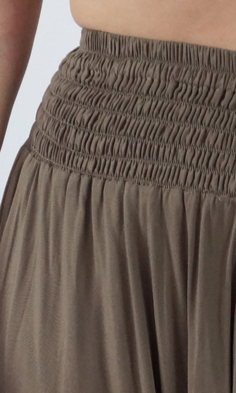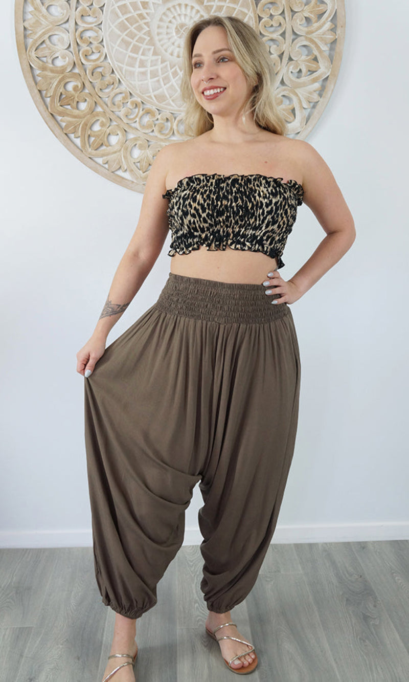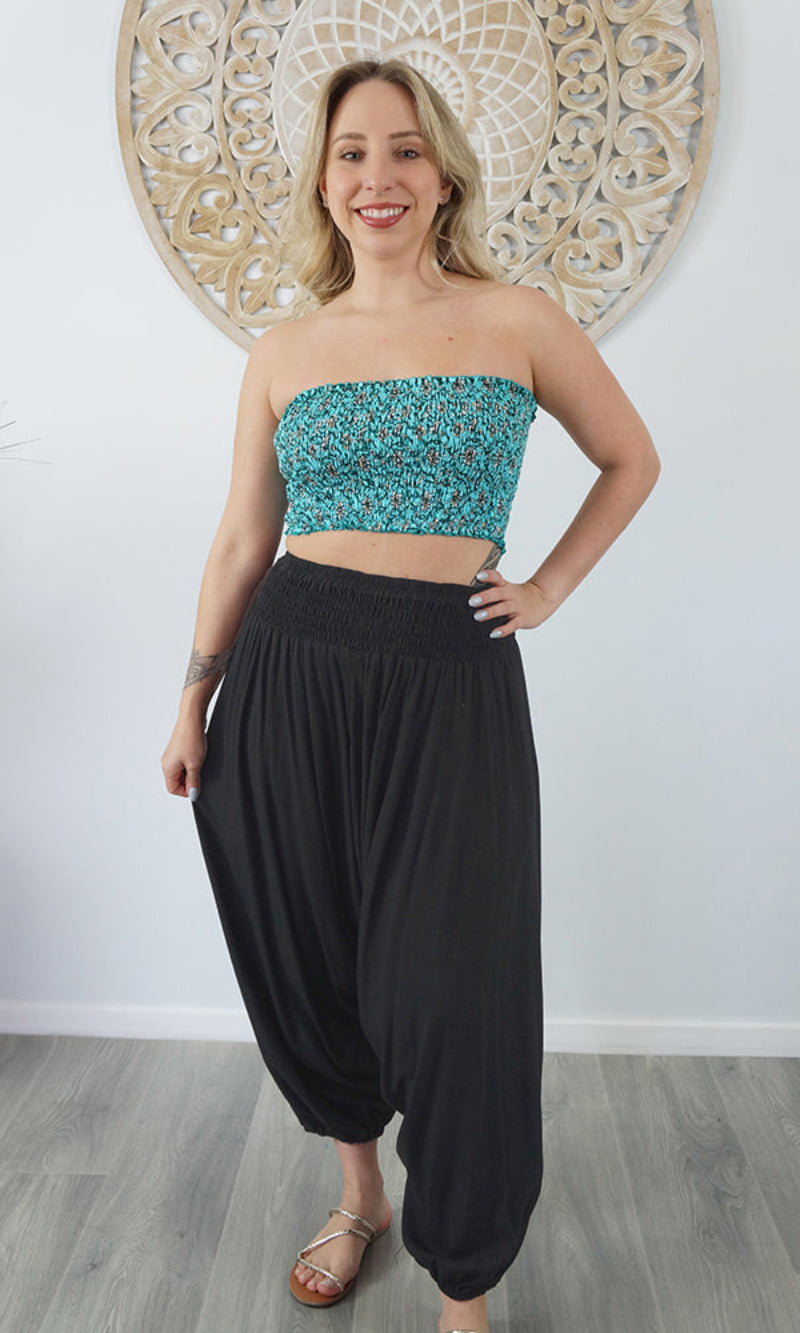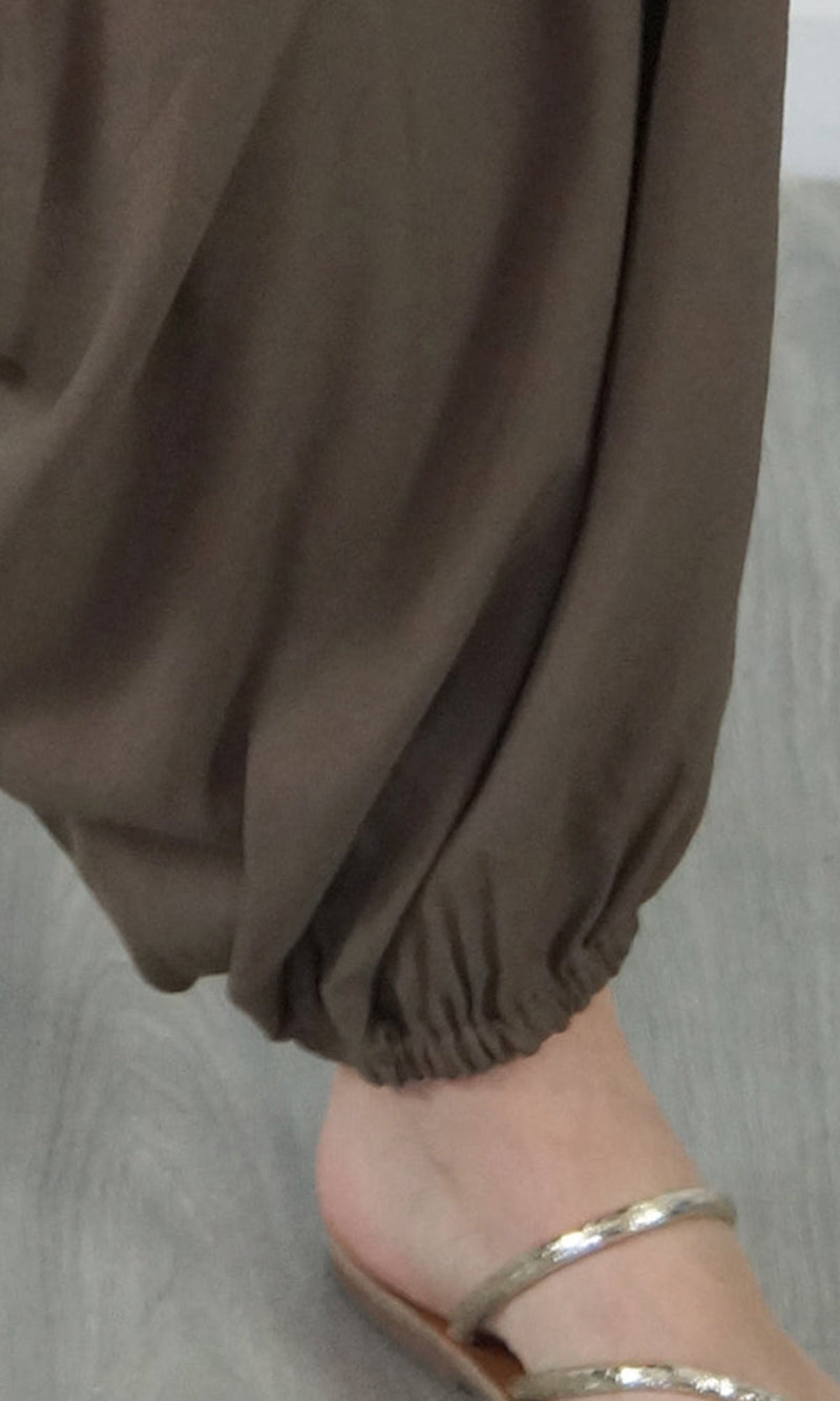 With an elastic shirring waist, low dropping crotch seam and elastic around the ankle this pant is truly comfort for everyday wear. ONE SIZE TO FIT 10-16