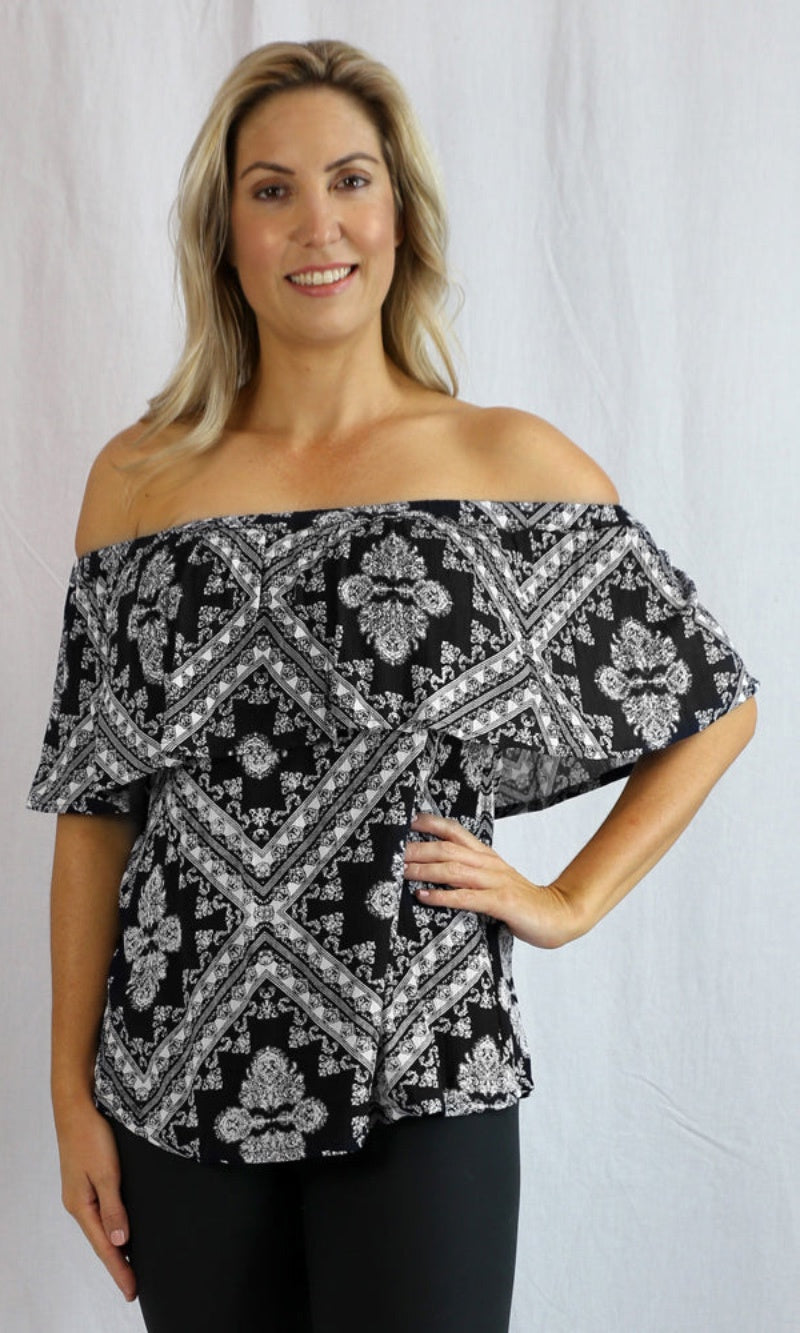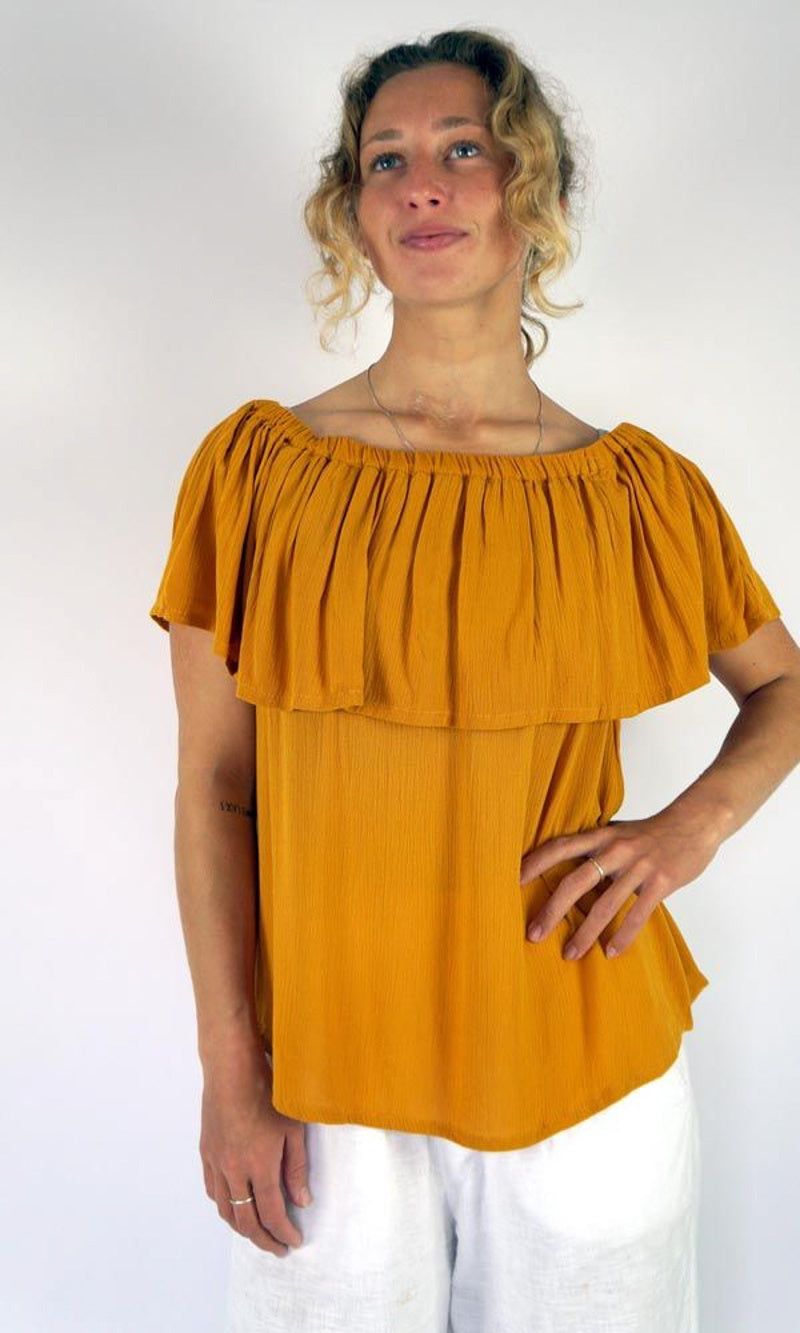 An off the shoulder flowy top with frill detail, made in a cool pre shrunk crinkle rayon. One size to fit 8-16