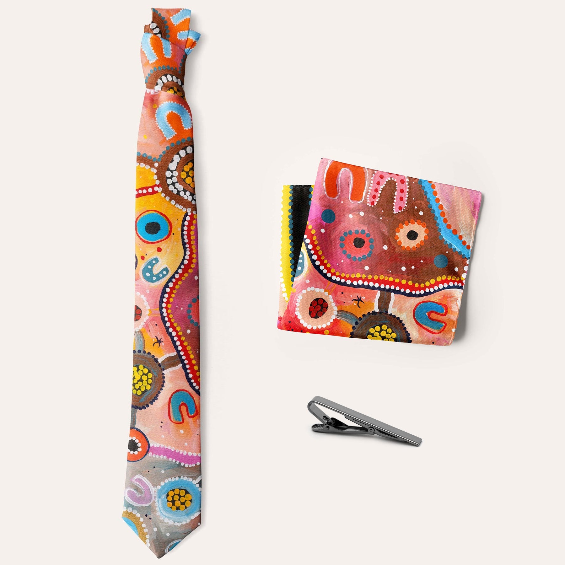 The set includes a necktie, a pocket square and a tie pin in a gift box.