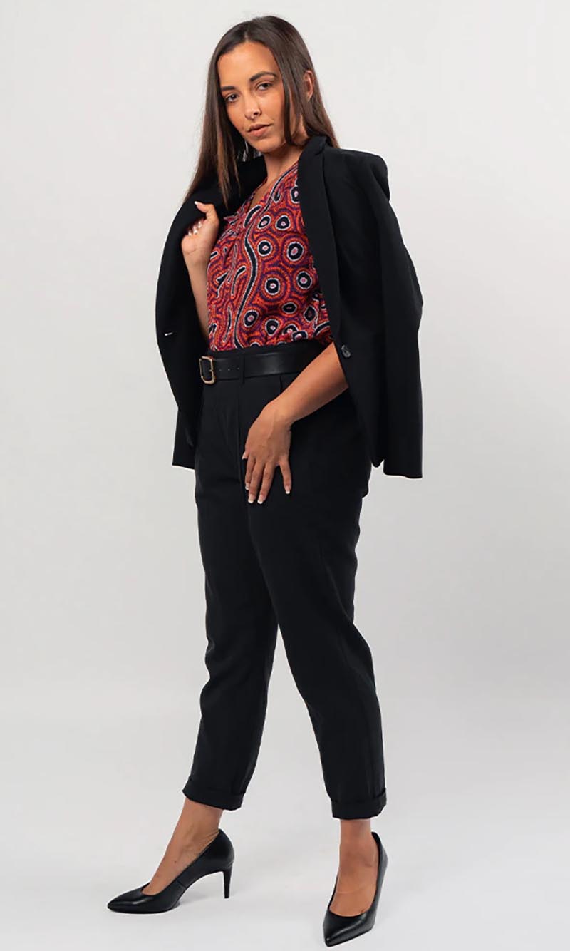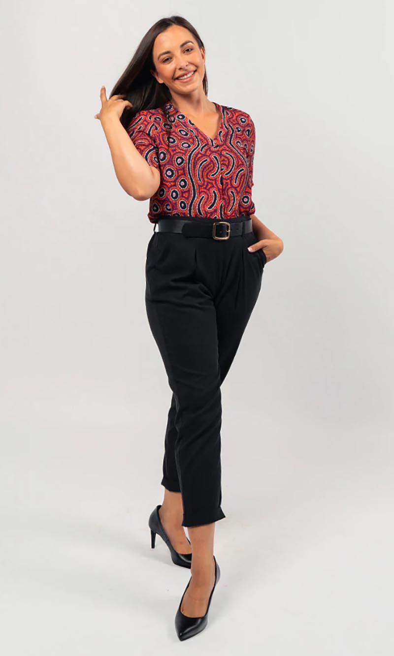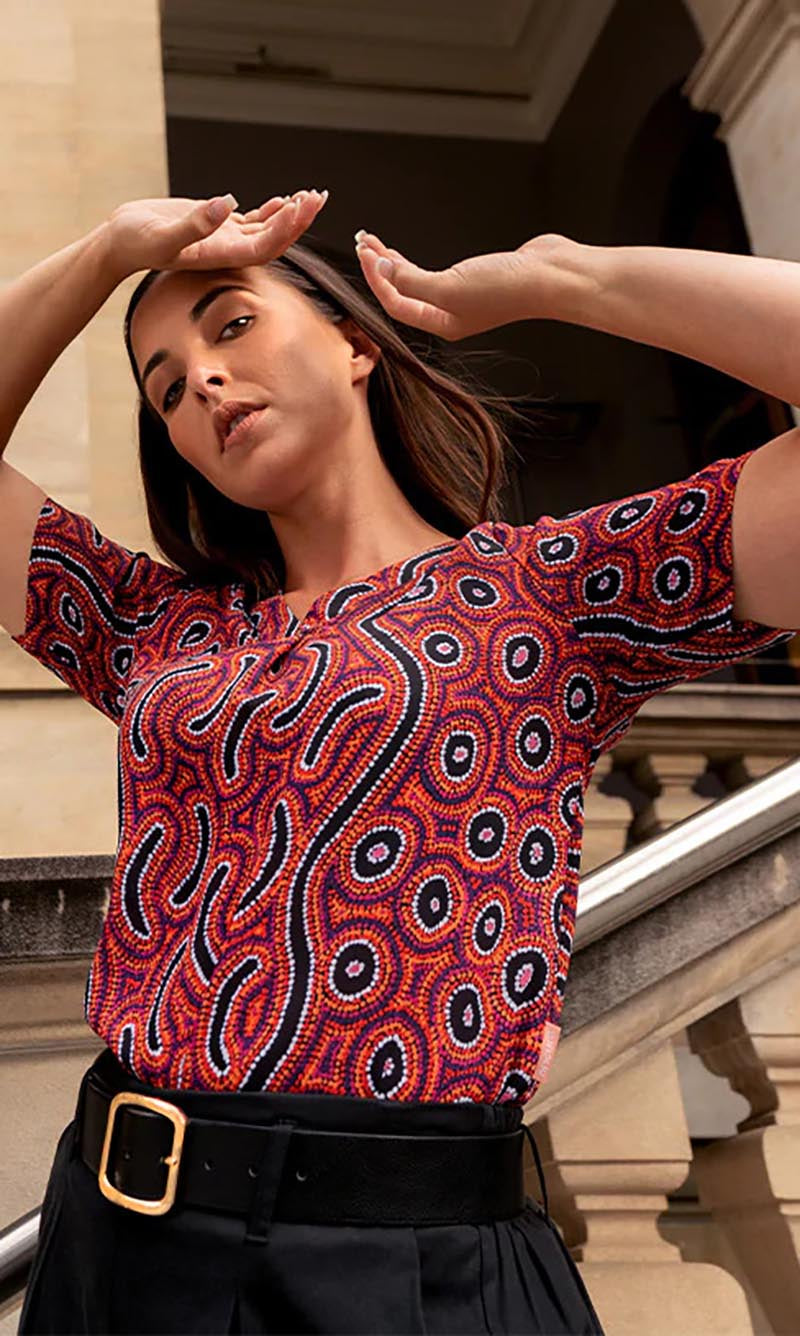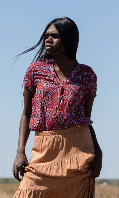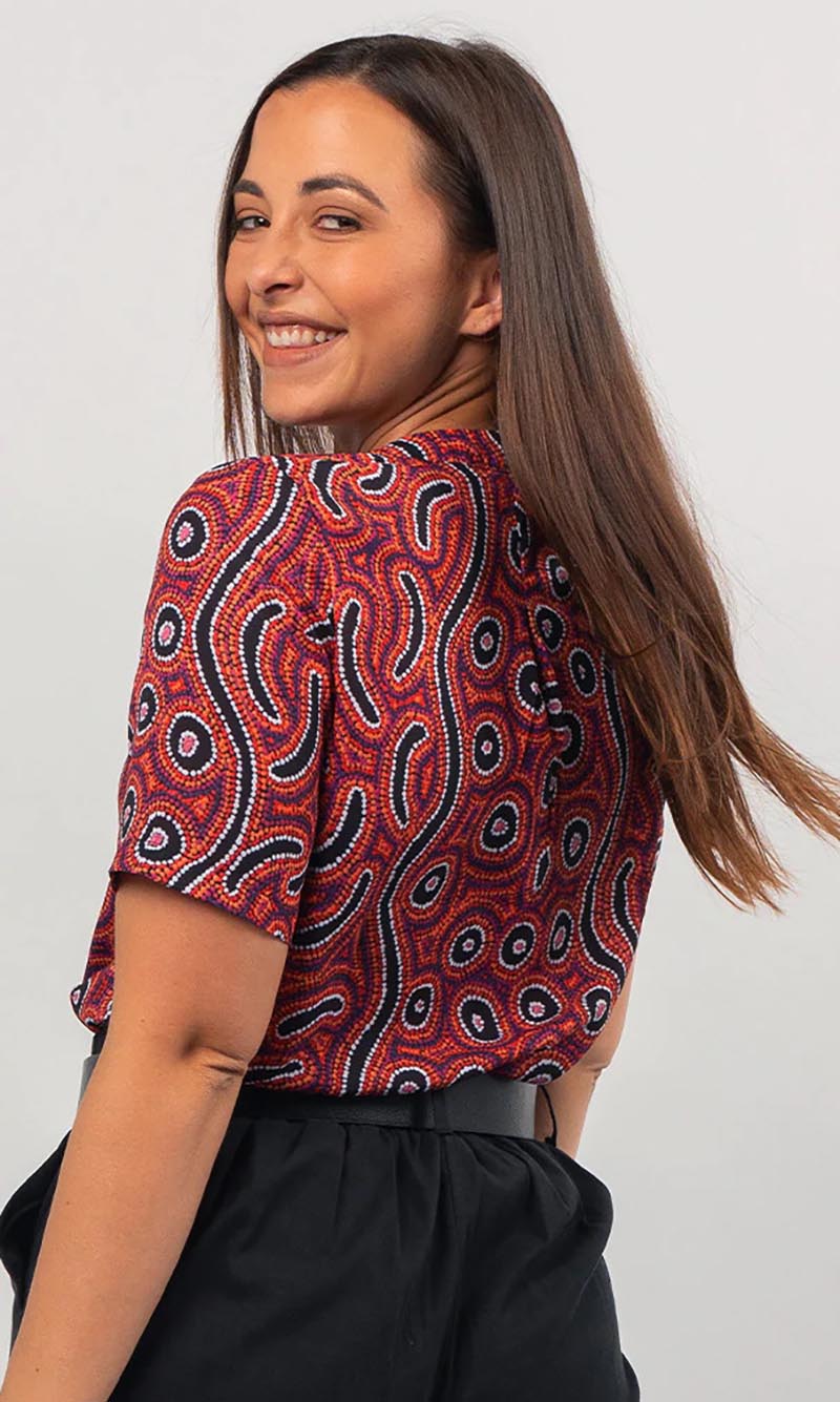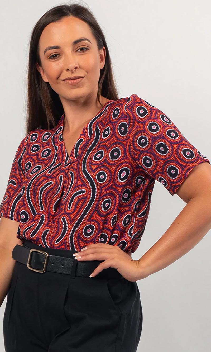 Aboriginal Art V-Neck Short Sleeve Woman's Blouse Lappi Lappi Jukurrpa