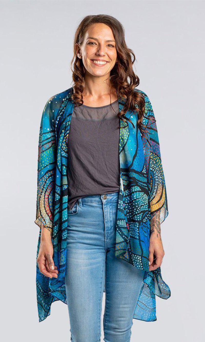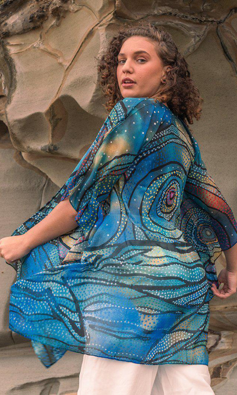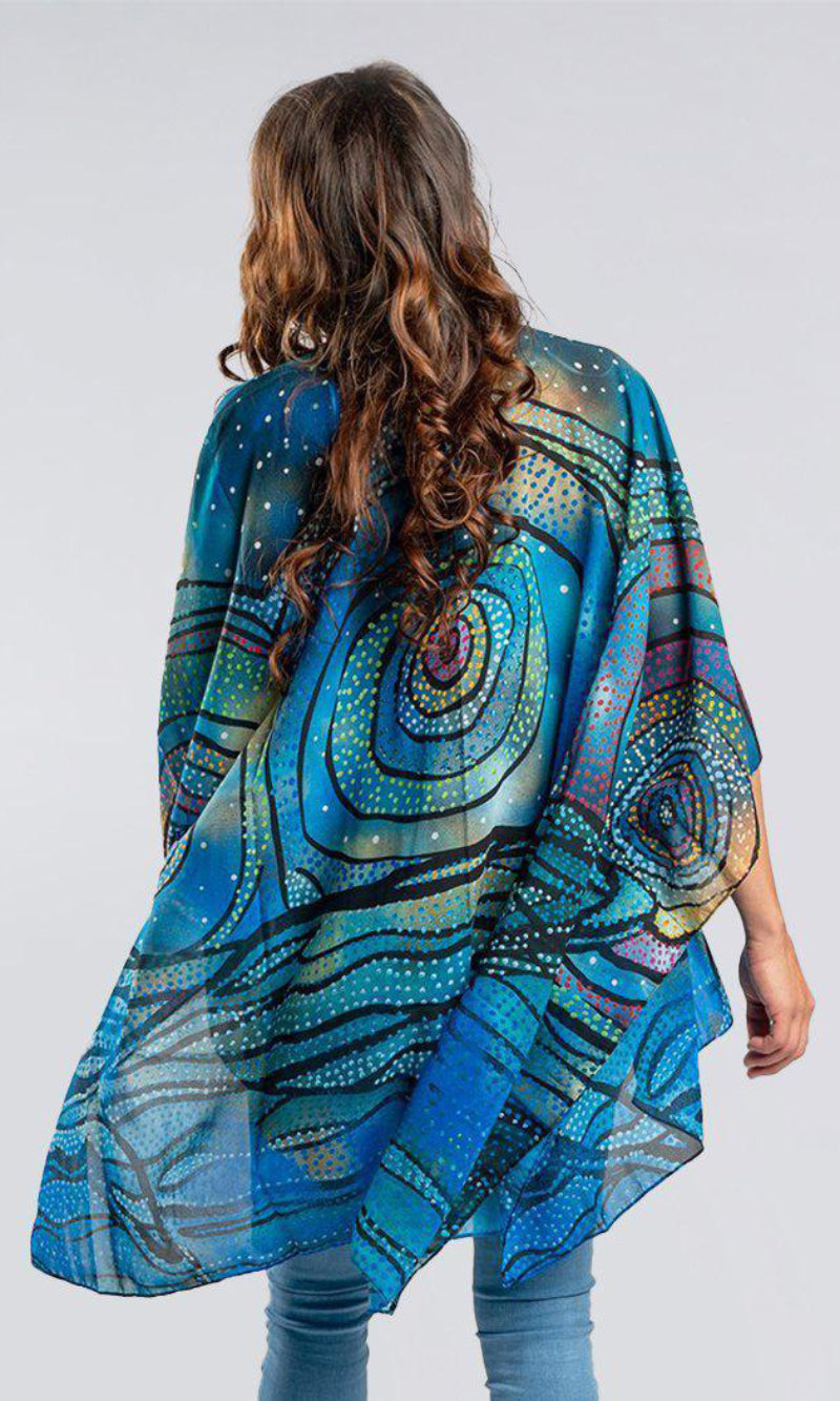 We welcome them every year. I view them as such majestic creatures which made me paint this whale under the night sky using these colours as it passes Quandamooka Country in the background. This is actually three circles presenting our clan groups Ngugi, Goenpul & Noonuccal.