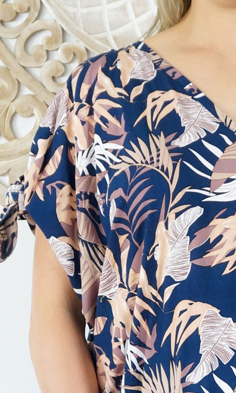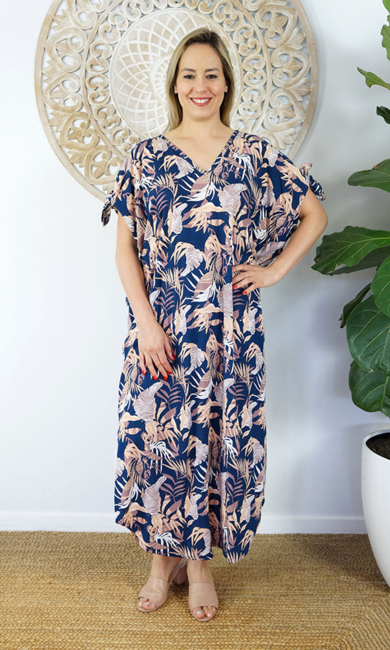 A simple but comfortable day dress This rayon garment features a v-neck line, front and back, cut out elbow length sleeves with tie.