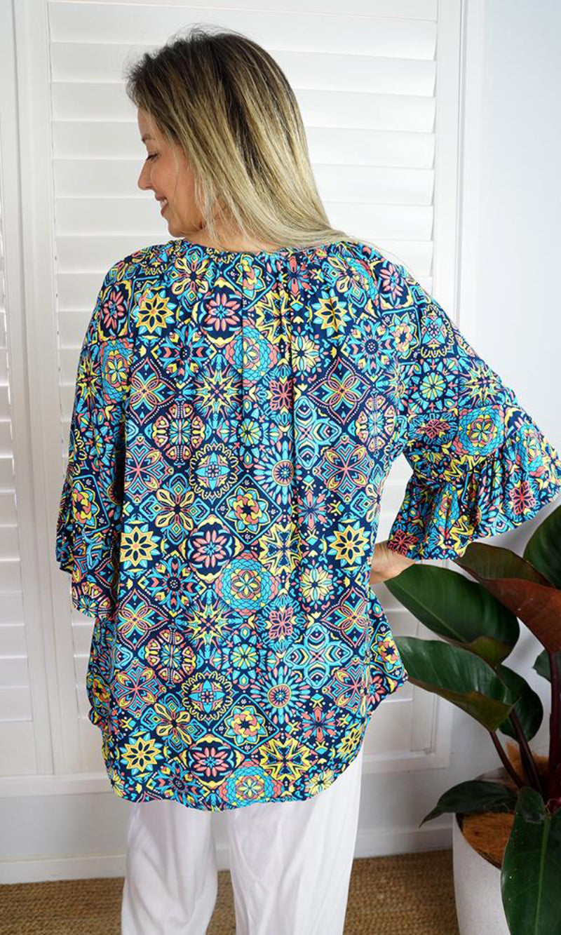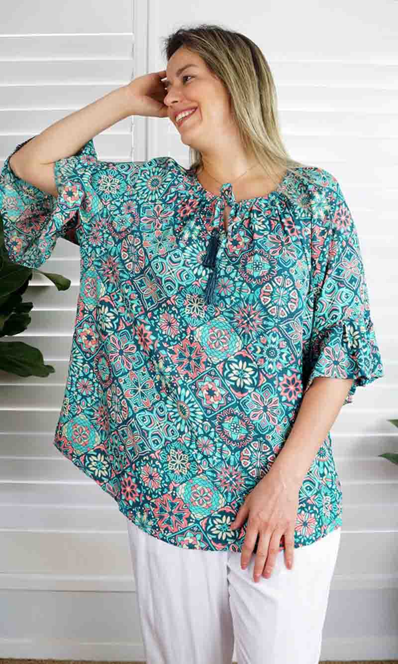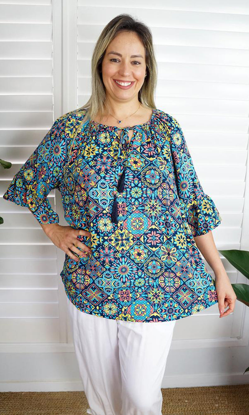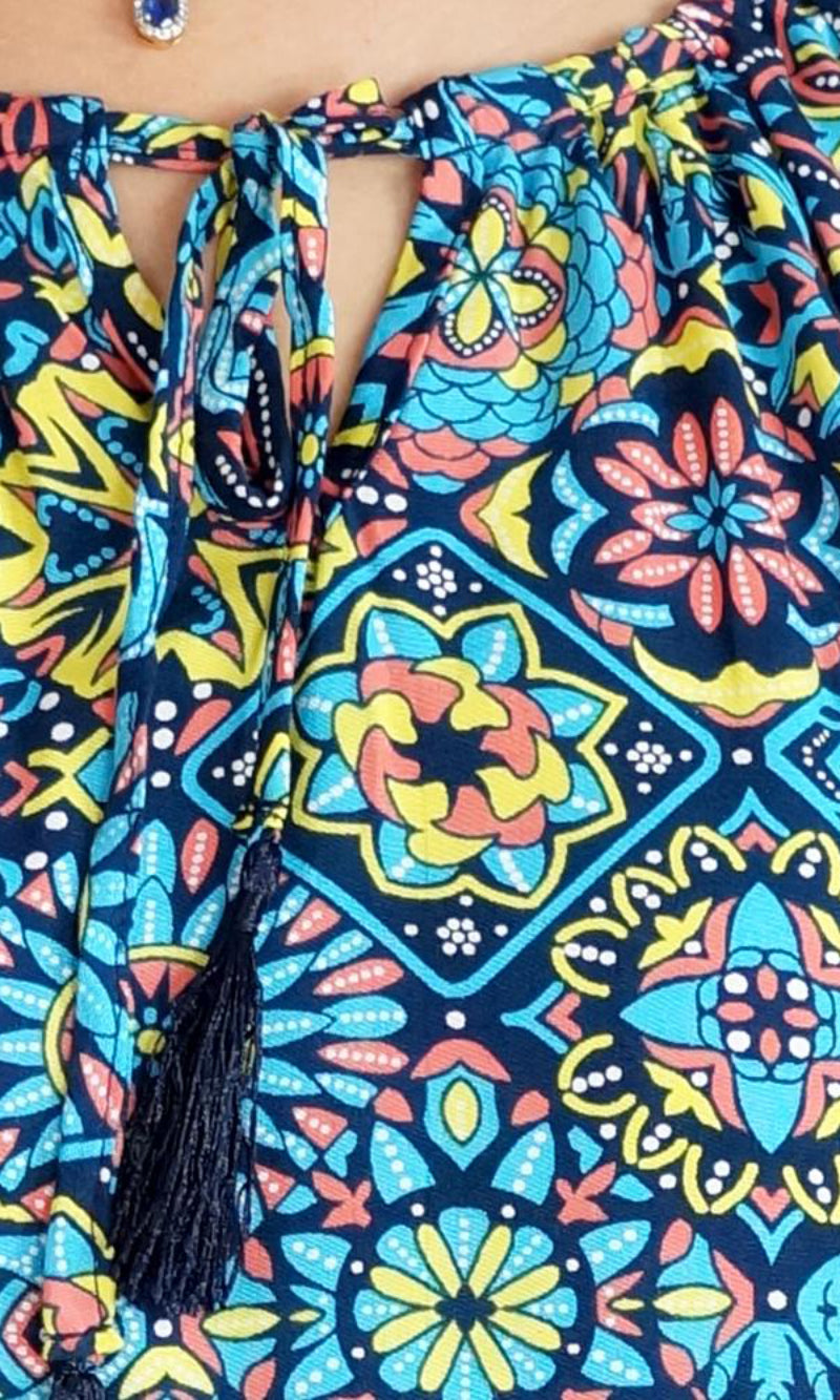Classic flat rayon style Top in "Dreamland" print with small bell arms and round neckline with tassel trims and tie. Available in 2 sizes.