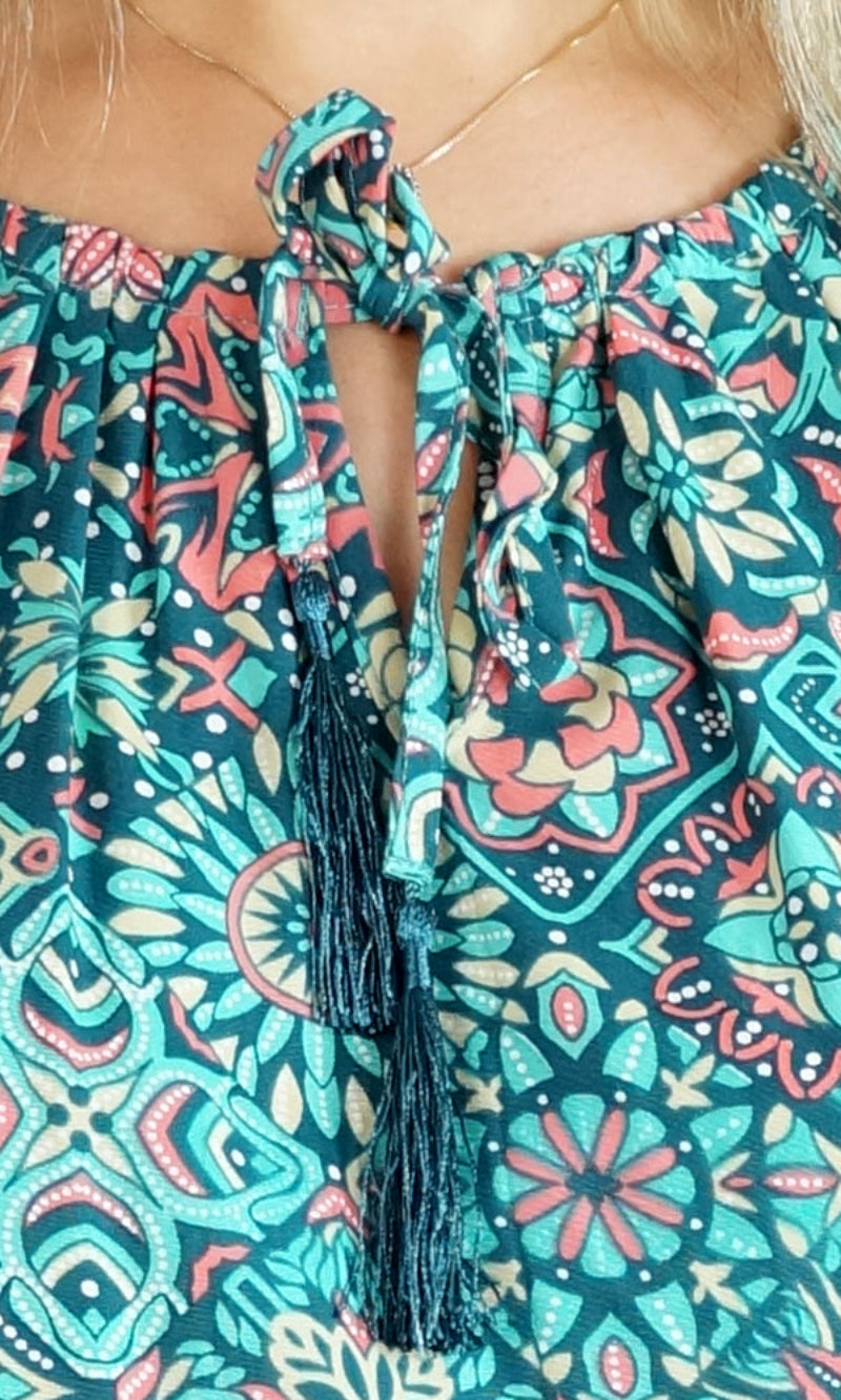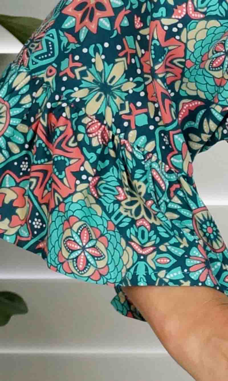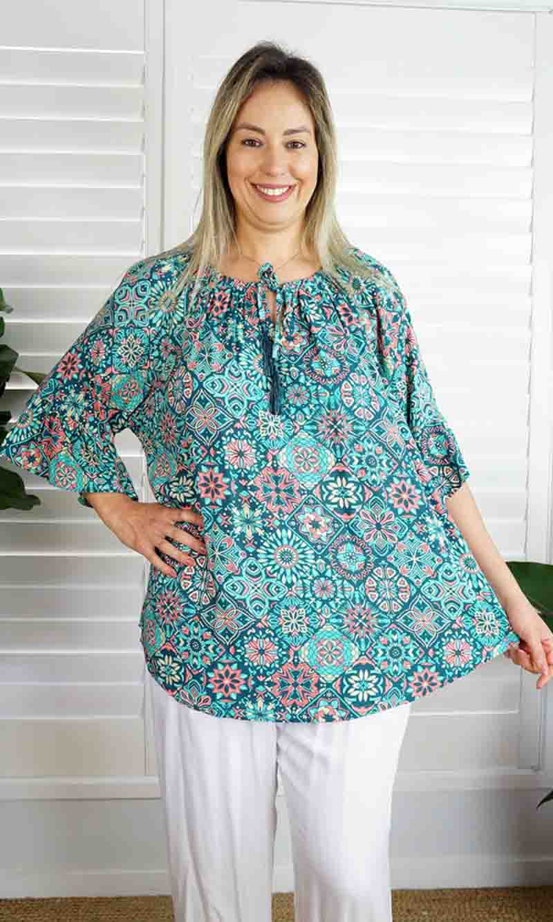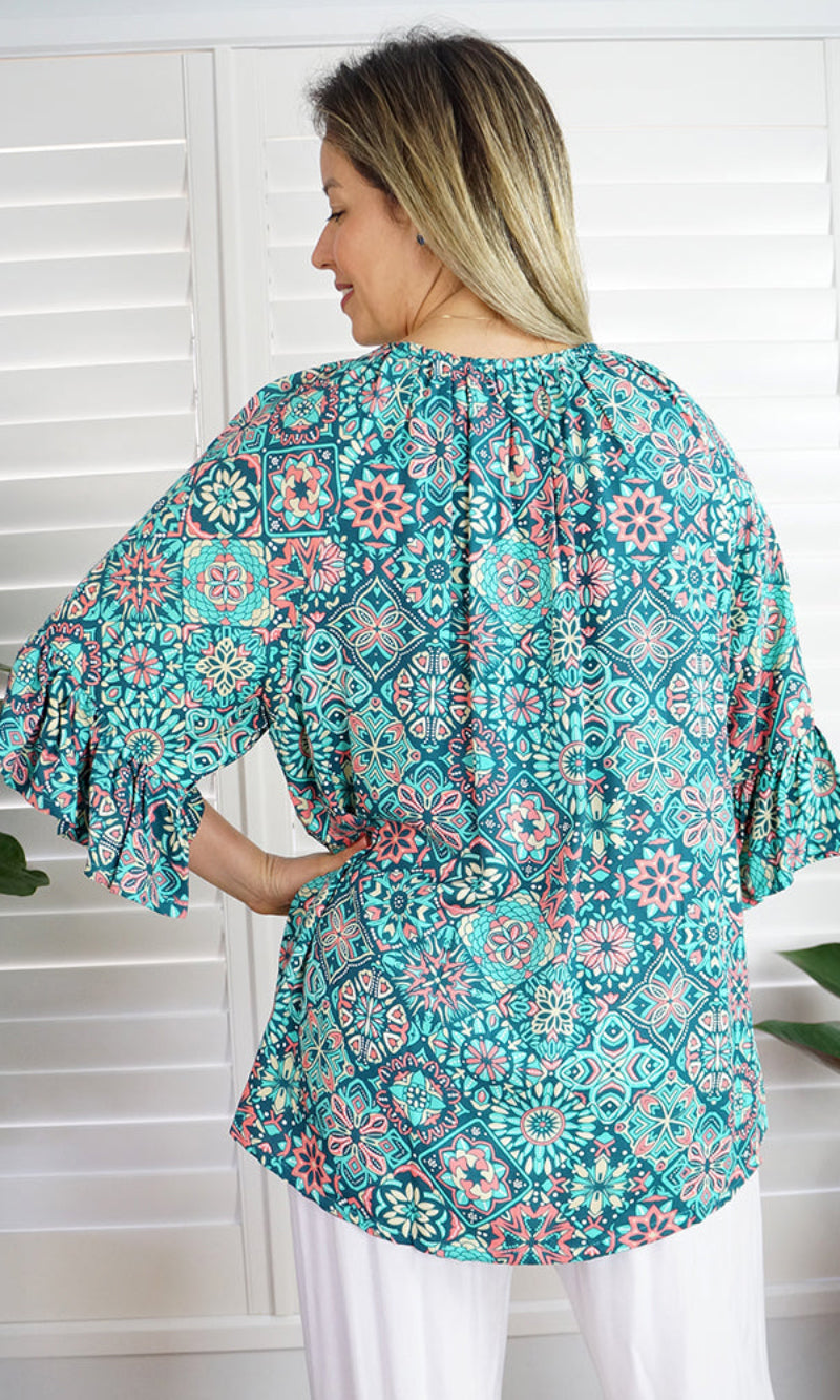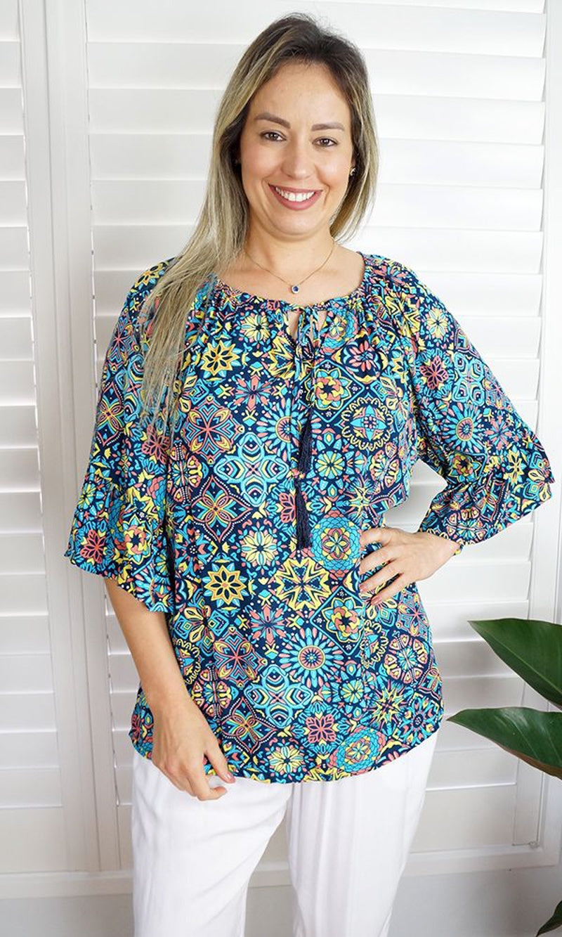 Classic flat rayon style Top in "Dreamland" print with small bell arms and round neckline with tassel trims and tie. Available in 2 sizes.
