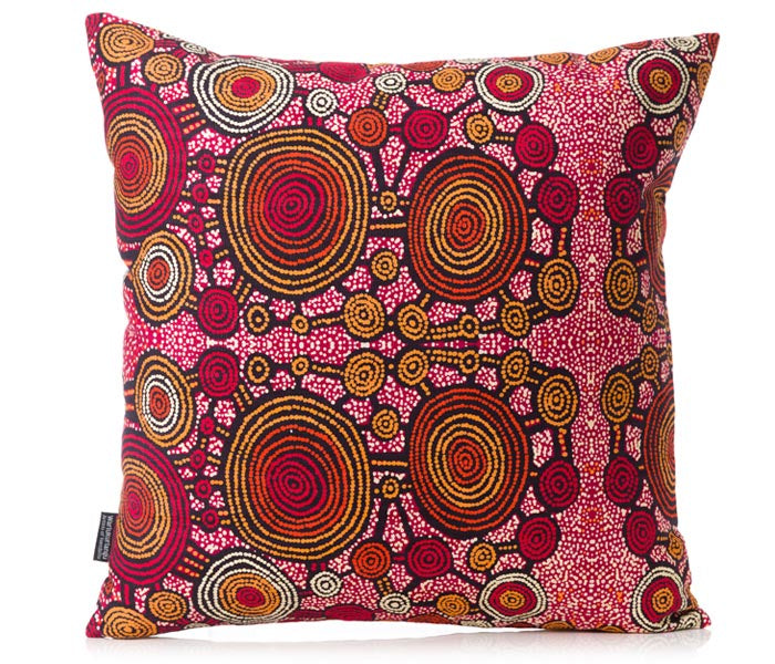 Australian Made Cotton Cushion Cover featuring licensed artwork by Teddy Gibson from Warlukurlangu Artists in the Northern Territory, Australia.