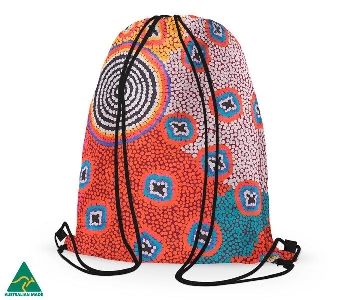 Step out in style with these great new Australian Made cotton drawstring bags featuring artwork by Ruth Stewart from Warlukurlangu Artists.