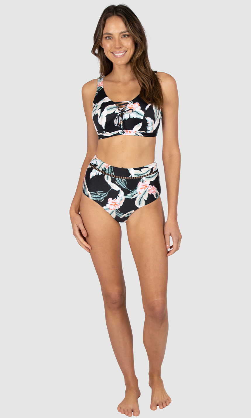 The Jamaica F/G Bra showcases a captivating lace-up detail, concealing its robust hidden underwire support, fortified by power mesh stability and enhanced by strategically placed boning for optimal structure, all secured by a convenient clip back.