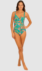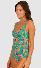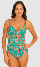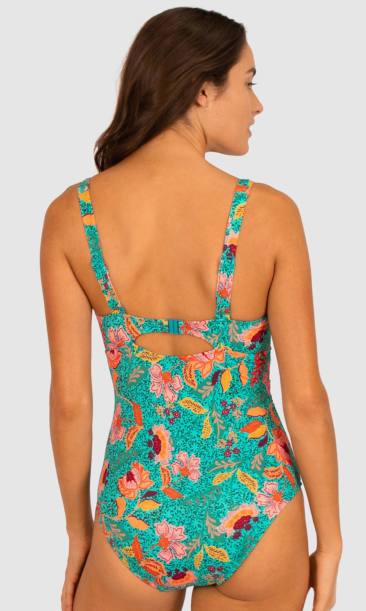Baku's Nomad Summer One Piece features a flattering draped detail around the front bust. It also features moulded underwire cups, removable booster pads and adjustable and convertible straps. It is fully lined with a clip back. Nomad summer is an abstract floral design that layers flora and fauna on to an tiny decorate pattern that scatters across the back ground while rich and opulent colours transport us to exotic lands.
