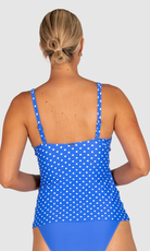 Baku's Parisian Summer D-E Cup Wrap Singlet Top, crafted for both style and support. Featuring hidden underwire support with power mesh stability, continuous shelf support and Lycra cup support, it ensures a comfortable and flattering fit. It also has adjustable and convertible straps for fit versatility, wrap detail.