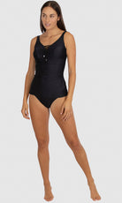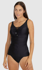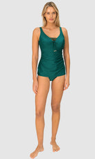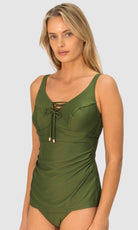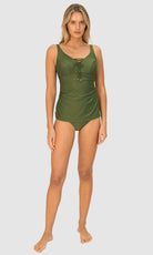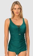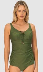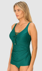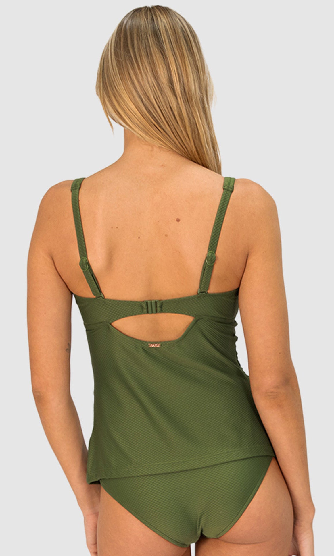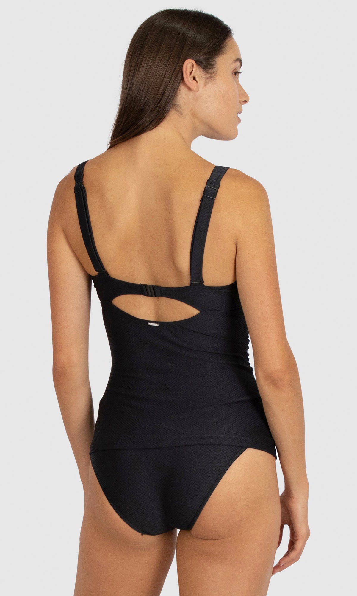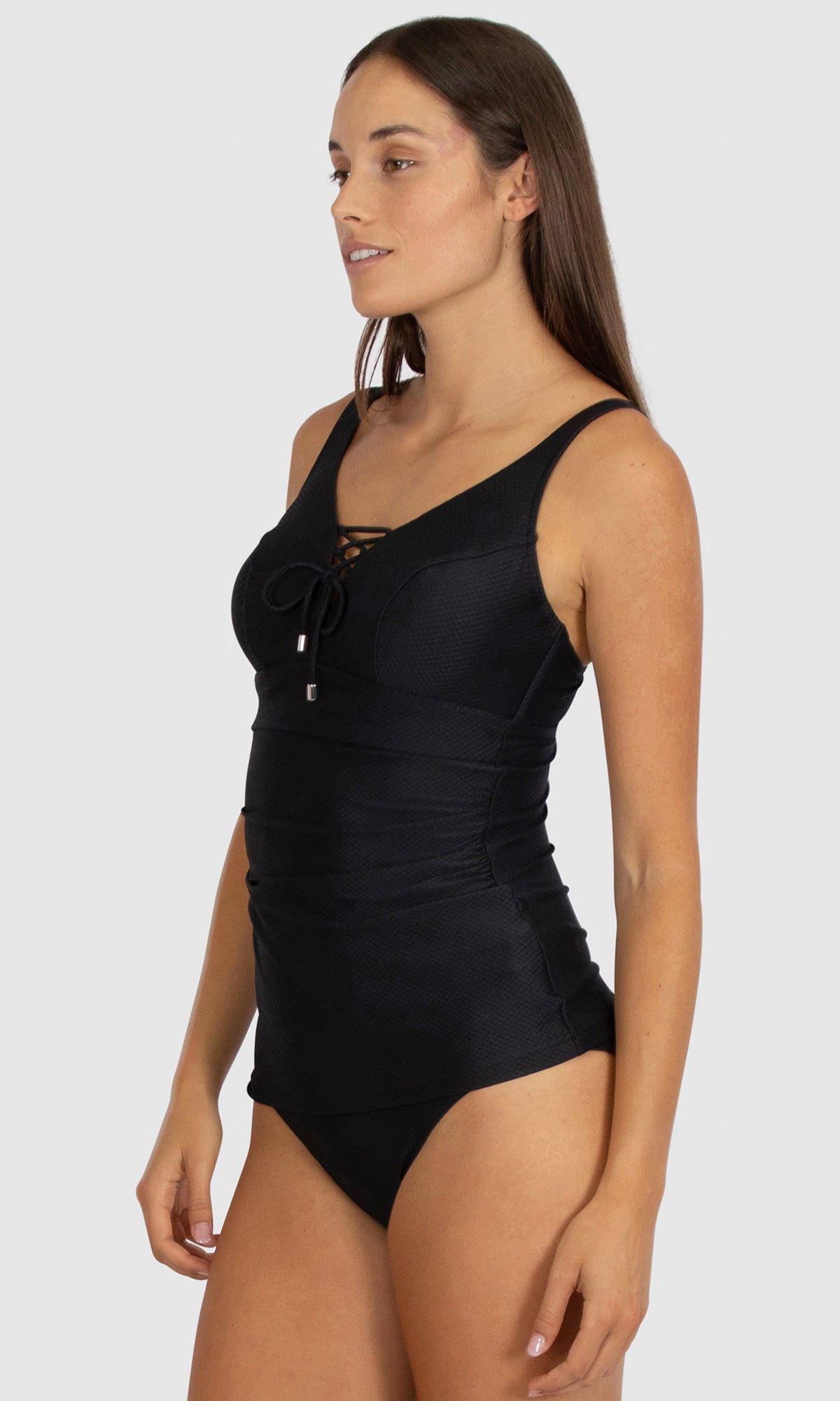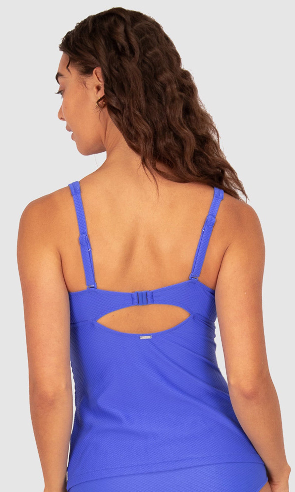Baku's Rococco F/G Underwire Tankini Swim Top features a flattering dropped neckline with a front lace up detail. It also features hidden underwire with power mesh stability, boning support. It has wide adjustable and convertible straps and fastens with a clip back. Rococco is a luxury textural fabrication from Spain that is buttery soft, yet sophisticated and structured.