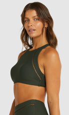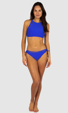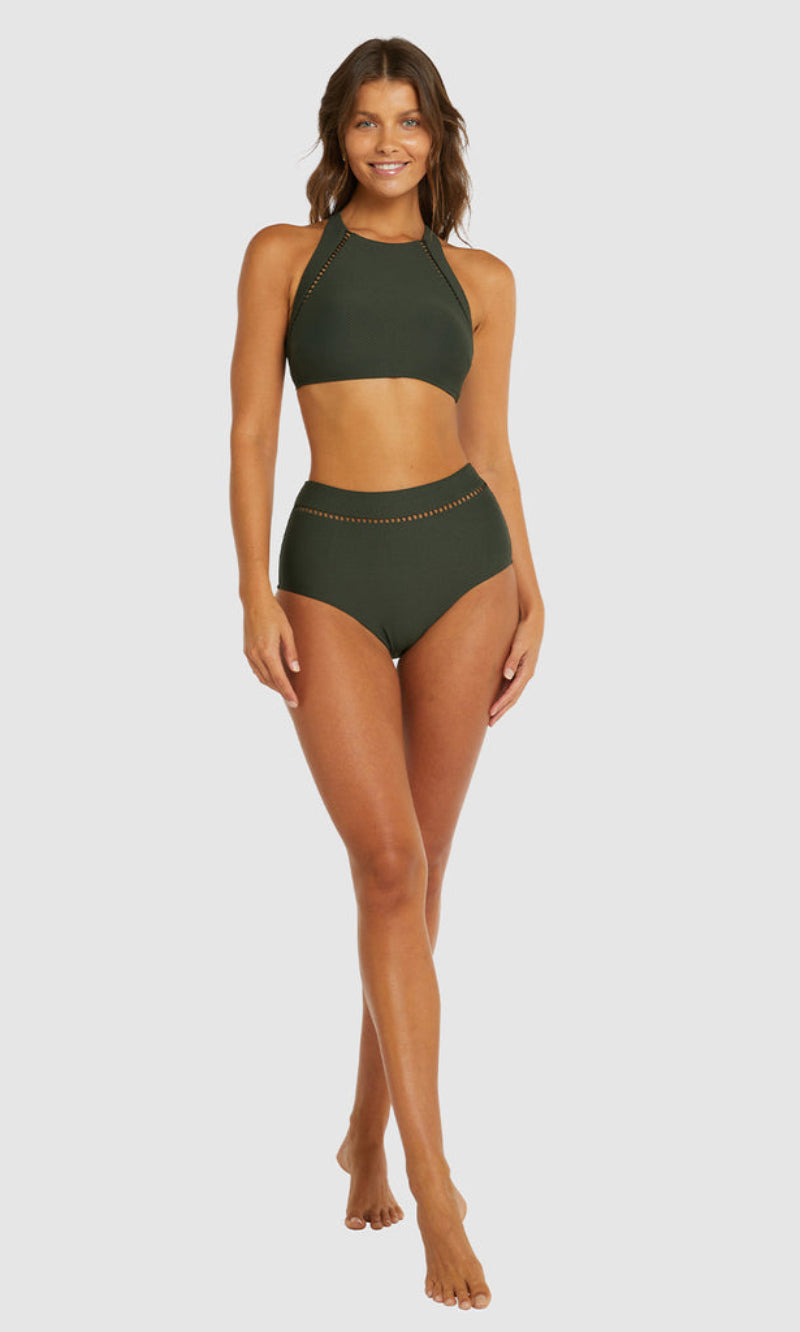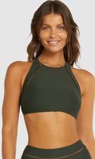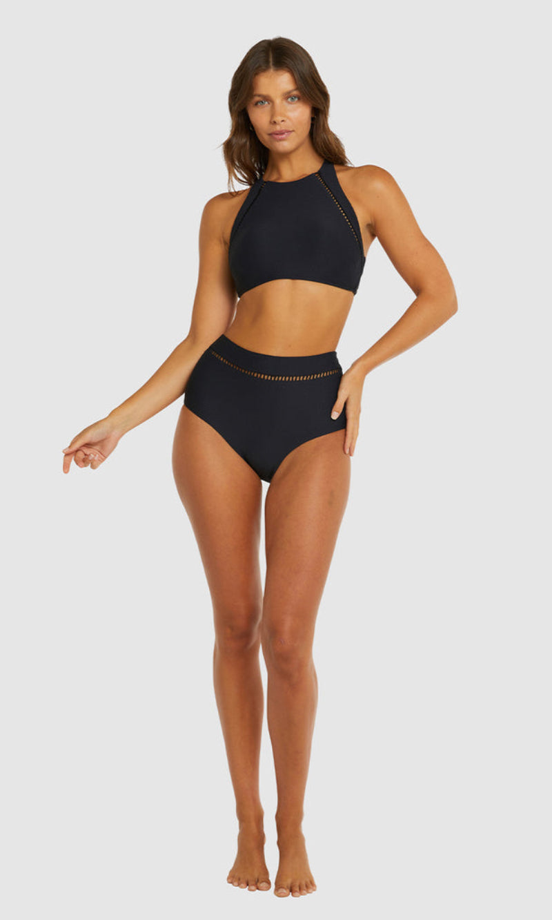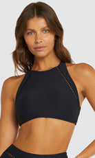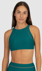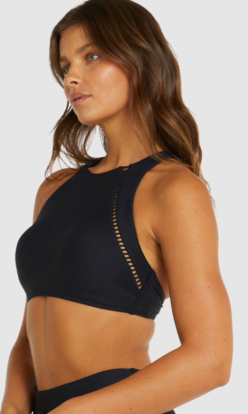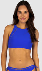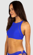 Baku's Rococco High Neck Bra Bikini Top features a flattering high neck line with ladder lace detailing. It also features removable cups, adjustable and convertible straps. Rococco is a luxury textural fabrication from Spain that is buttery soft, yet sophisticated and structured.