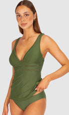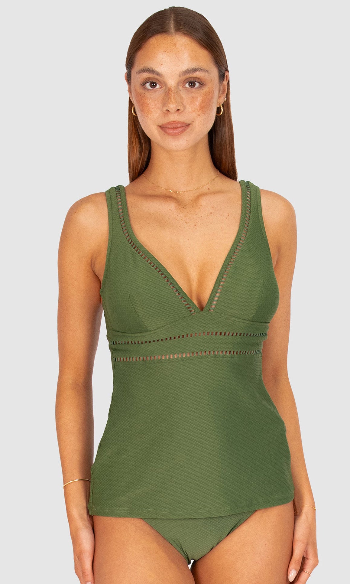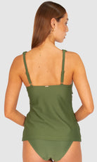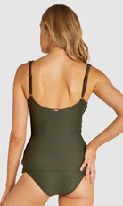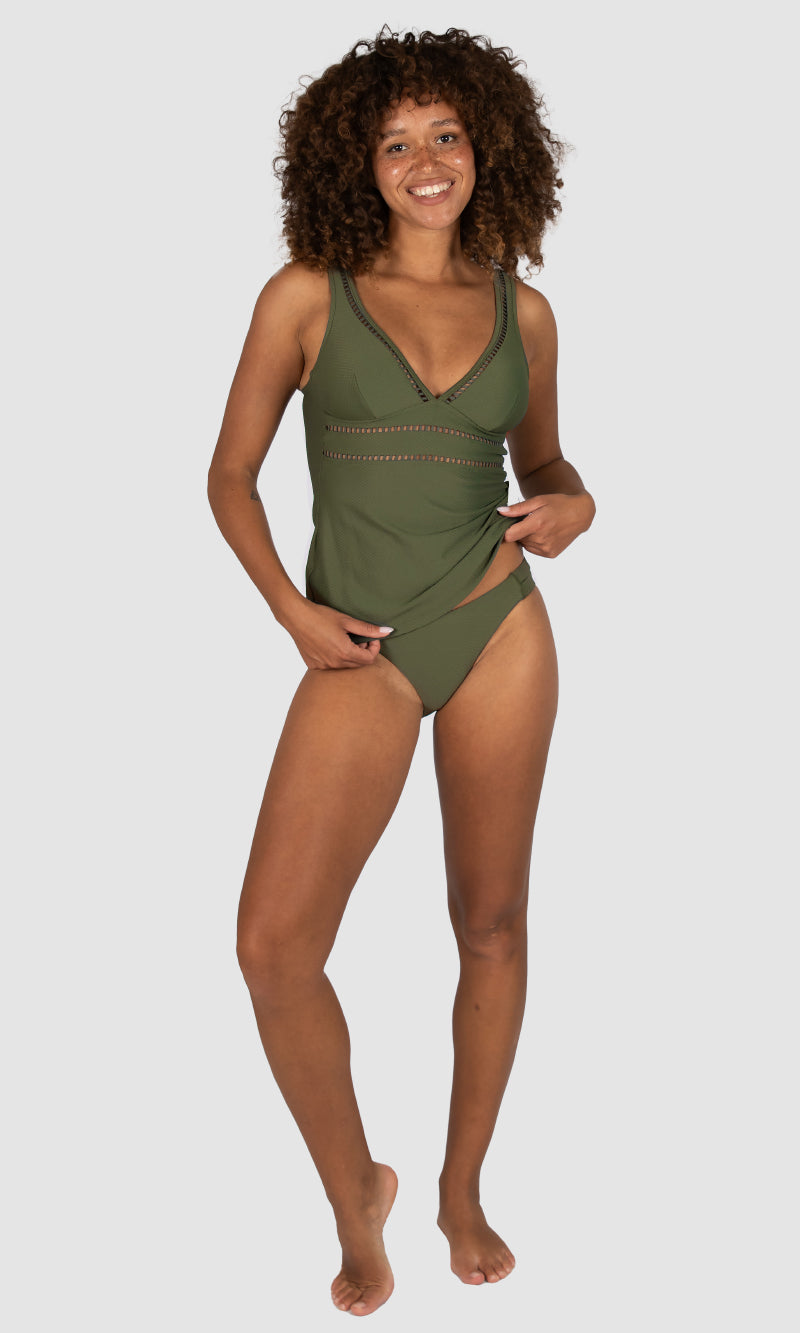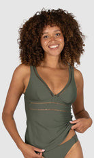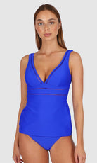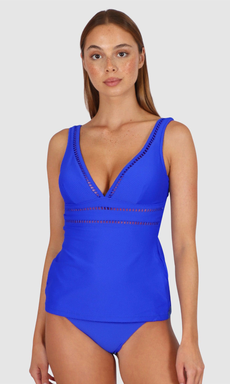 Baku's Rococco Longline Tankini Top features a flattering dropped v-neckline highlighted with ladder lace along the front neck and under bust. It has soft removable cups, ladder lace detail, lycra under bust support and adjustable straps. Rococco is a luxury textural fabrication from Spain that is buttery soft, yet sophisticated and structured.