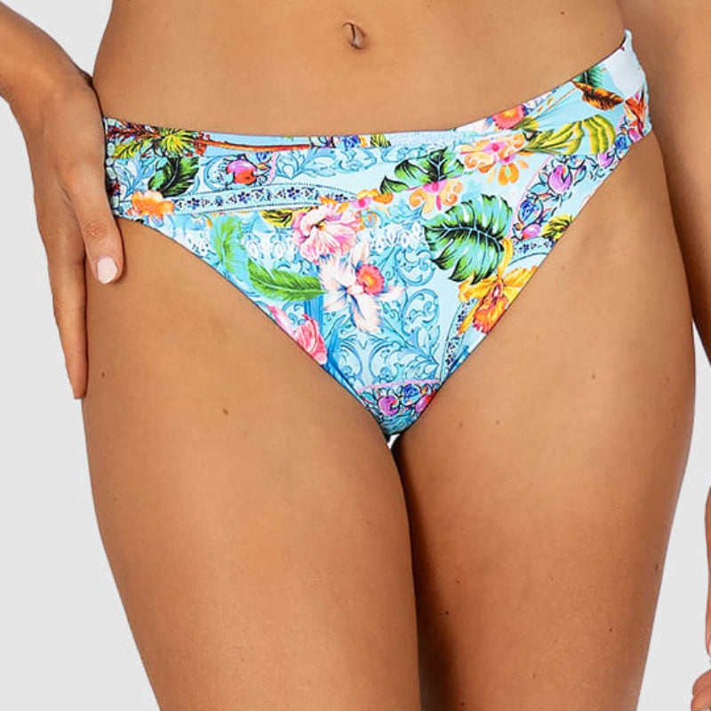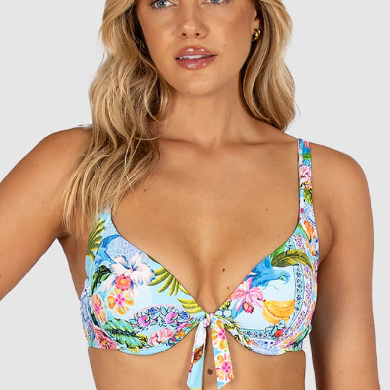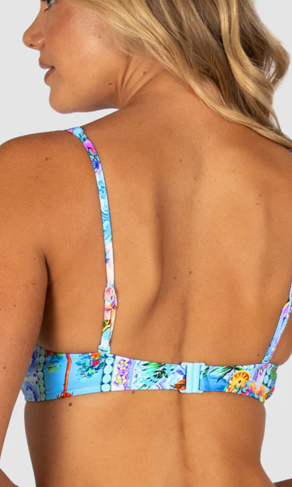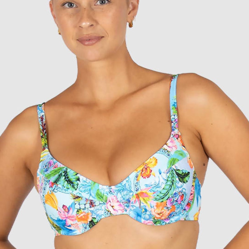 The Sardinia Dream Support Booster Bikini Bra Top features moulded underwire cups, removable booster pads, adjustable and convertible straps, and clip-back soft side panels for added coverage and support.