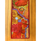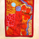 This design is from an original painting of Damien’s country, Mt. Liebig, west of Papunya. Damien’s great grandfather and his family are travelling through the desert towards Kintore, collecting food. In the bottom right hand corner the sun is setting over a hillside. The family stops to camp at different places along the way. The red concentric circles are dry rockholes, and the blue and white concentric circles represent rockholes that are filled with clean water, that flows on into the creek. The red stripes coming out of the centre of the right hand side of the painting lead to one of these waterholes – these are the tracks of the family walking through the sand. In this painting you can also see spinifex bushes (the yellow star-like symbols), and dry claypans with cracks in the earth.