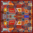 This painting depicts linear pattern ‘body paint design’. The Aboriginal women paint their breasts and shoulders for ceremonies, which include song and dance used to tell their ancient stories. The concentric circles symbolise ceremonies or meeting place.