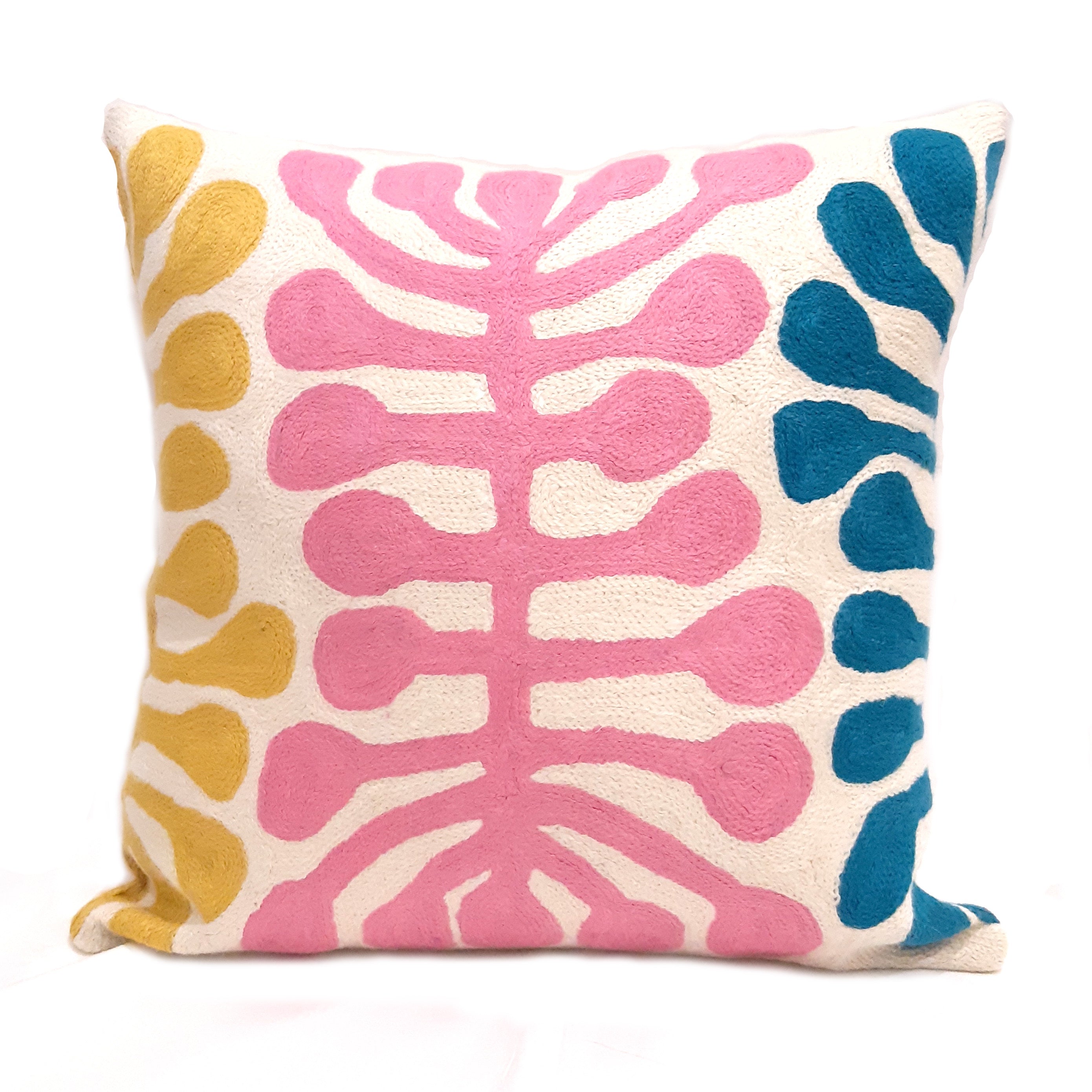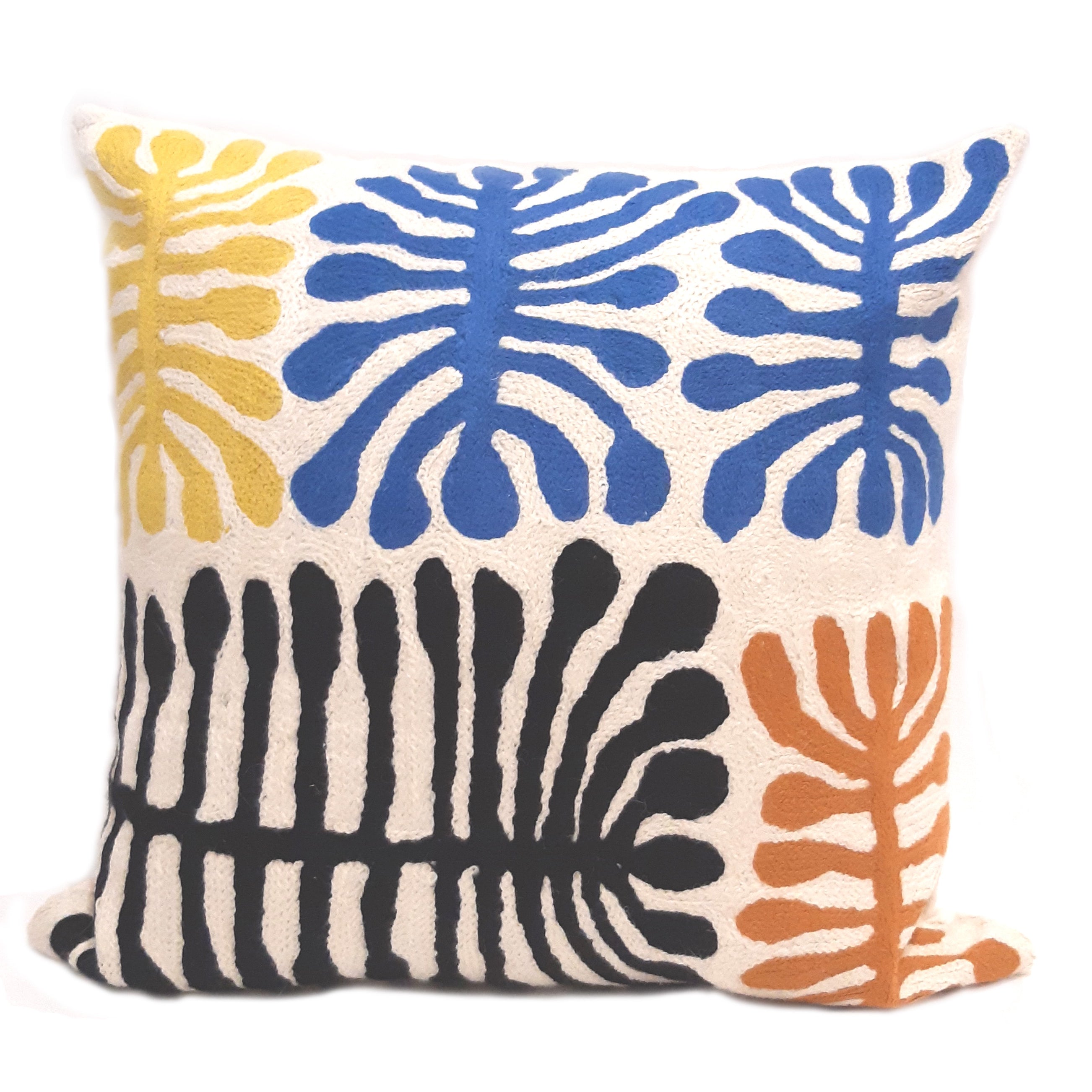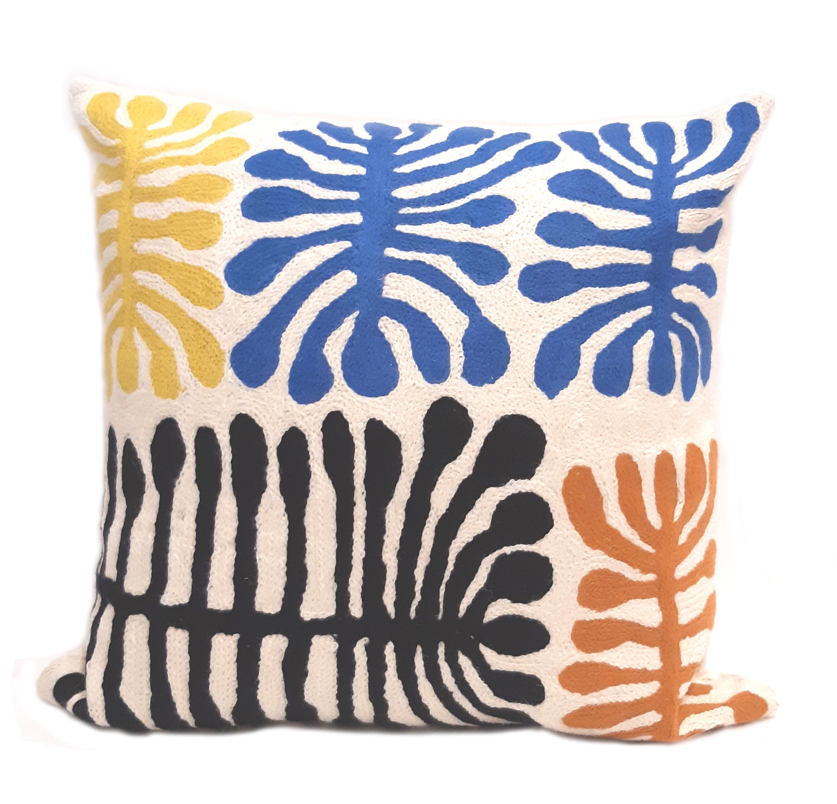 These beautiful, unique textiles are a cross -cultural collaboration combining Aboriginal designs and tradional Kashmiri handicraft. The chain-stitched (Gabba in local Kashmiri) cushions are hand stitched by