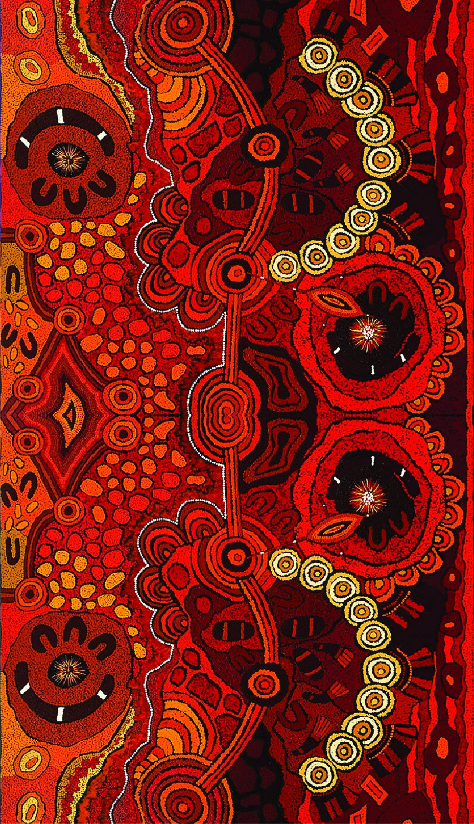 This piece tells the story of Yilpi’s grandfather and the hailstorm that killed him. As a young man he was stubborn and didn’t listen to the elders that a big storm was coming. He went out hunting before the storm. He also wanted to perform a ceremonial dance to ward of the storm. He took the ceremonial dancing sticks, but didn’t return. The rest of the clan hid in the caves to wait out the storm and afterwards, the women went searching for the man but could not find him. In another area of the country, the children were gathering bush foods and swimming in the newly filled rockhole’s. Quite by accident, they happened upon the body of the young man. He had died during the storm. This story is told to the children to teach them the importance of listening to their elders.