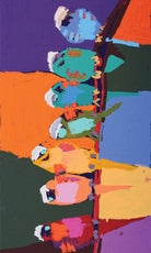 This painting depicts linear pattern ‘body paint design’. The Aboriginal women paint their breasts and shoulders for ceremonies, which include song and dance used to tell their ancient stories. The concentric circles symbolise ceremonies or meeting place.