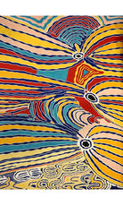 The main motif of this painting depicts the wakirlpirri (dogwood [Acacia coriacea]) tree. Wakirlpirri is a very useful tree that grows on the sides of creek beds and near mulga trees. The seeds of this tree can be eaten raw or cooked on the fire. A deliciously sweet drink called yinjirrpi is made from the seeds when they have been dried. The wood can be used to make weapons such as karli (boomerangs) and dancing boards for ceremonies. It is also good wood for burning on the fire because rain cannot extinguish burning Wakirlpirri wood. In contemporary Warlpiri paintings traditional iconography is used to represent the Jukurrpa, particular sites and other elements. This Jukurrpa travels from Jarrarda-Jarrayi through to Puturlu (Mount Theo) west of Yuendumu. This Jukurrpa belongs to Japanangka/Japangardi men and to Napanangka/Napangardi women.