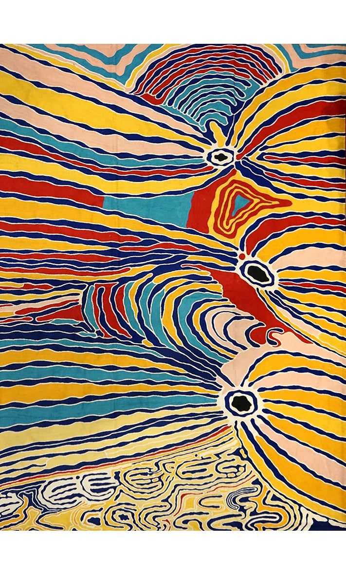These beautiful, unique rugs are a cross-cultural collaboration combining Aboriginal designs and traditional Kashmiri rug-making techniques. Chain stitched, using hand-dyed wool and finished with a heavy cotton backing, each rug is a completely handmade piece. This project is unusual because the rug is owned by the artists, rather than licensed to a third party. A more empowering way to work, this brings many direct benefits to the artists’ and their community. Control and ownership of intellectual property are also maintained. Purchase of these rugs guarantees a direct return to the Aboriginal artist and their community.