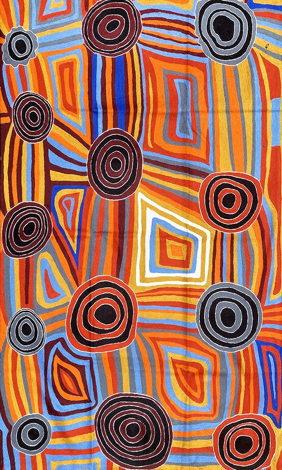 This painting depicts linear pattern ‘body paint design’. The Aboriginal women paint their breasts and shoulders for ceremonies, which include song and dance used to tell their ancient stories. The concentric circles symbolise ceremonies or meeting place.