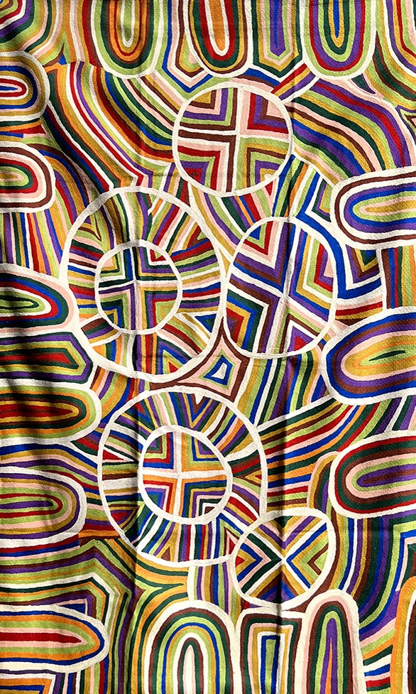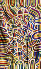 These beautiful, unique rugs are a cross-cultural collaboration combining Aboriginal designs and traditional Kashmiri rug-making techniques. Chain stitched, using hand-dyed wool and finished with a heavy cotton backing, each rug is a completely handmade piece. This project is unusual because the rug is owned by the artists, rather than licensed to a third party. A more empowering way to work, this brings many direct benefits to the artists’ and their community. Control and ownership of intellectual property are also maintained. Purchase of these rugs guarantees a direct return to the Aboriginal artist and their community.