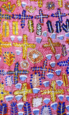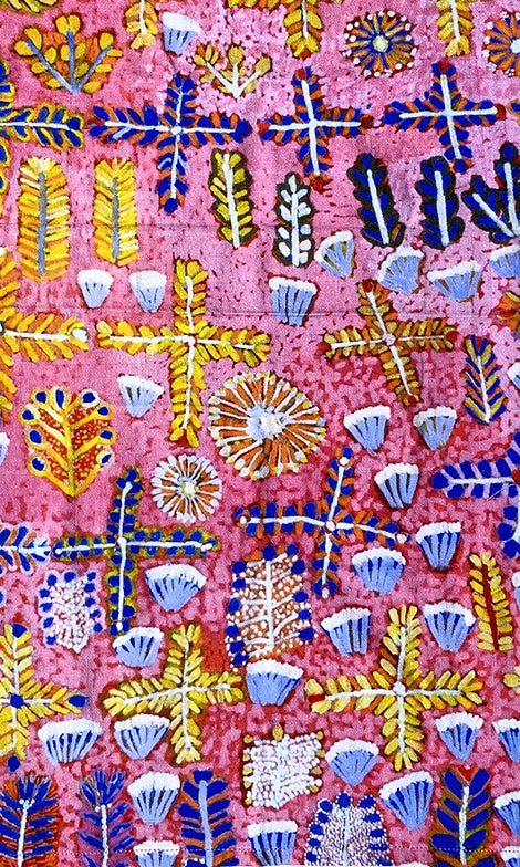 STORY: The community of Ampilatwatja made a conscious decision not to paint altyerr dreaming stories. The artists paint their country where those stories sit. This artwork shows some of the many plants in the landscape. these plants have a high level of significance for the local people, being useful as medicine, or as food for people or for wildlife.