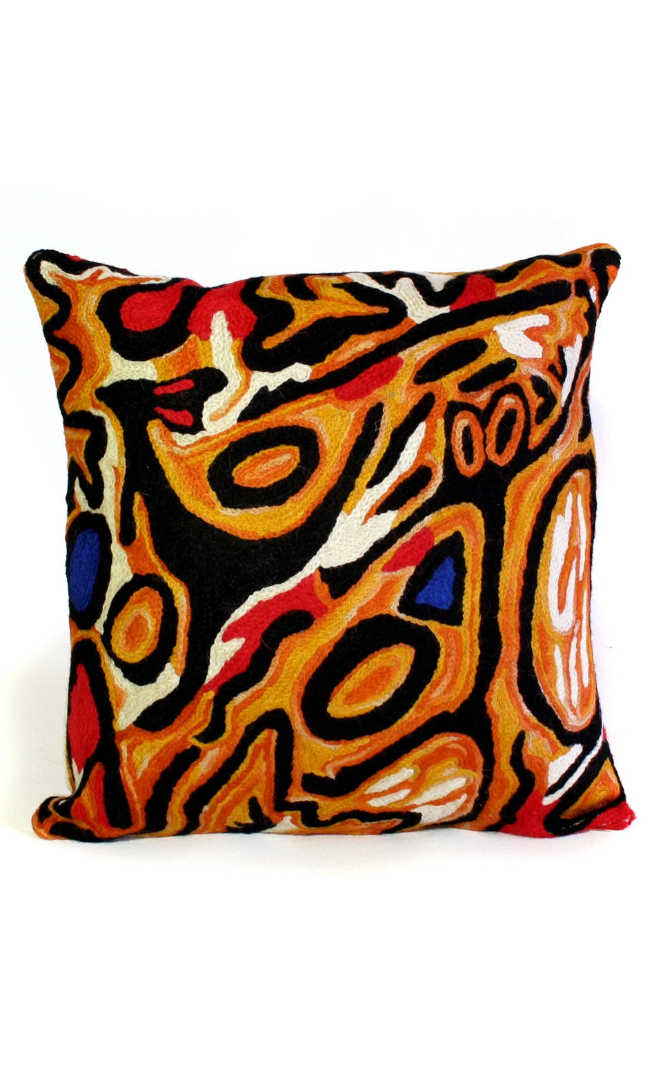 These beautiful, unique textiles are a cross -cultural collaboration combining Aboriginal designs and tradional Kashmiri handicraft. The chain-stitched (Gabba in local Kashmiri) cushions are hand stitched by