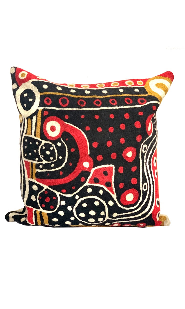 These beautiful, unique textiles are a cross -cultural collaboration combining Aboriginal designs and tradional Kashmiri handicraft. The chain-stitched (Gabba in local Kashmiri) cushions are hand stitched by