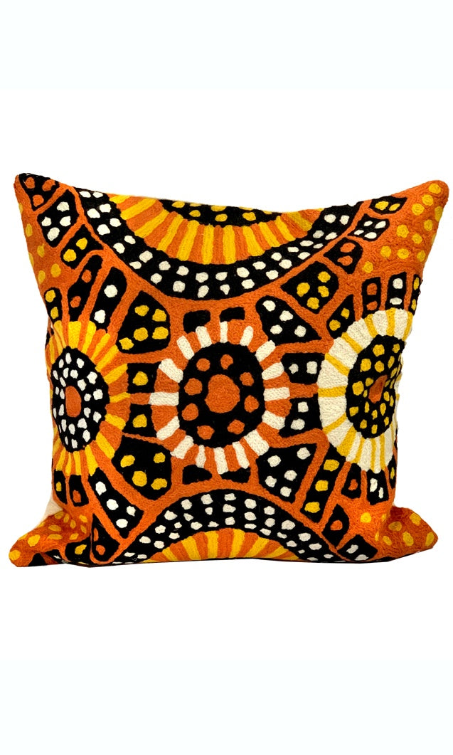 These beautiful, unique textiles are a cross -cultural collaboration combining Aboriginal designs and tradional Kashmiri handicraft. The chain-stitched (Gabba in local Kashmiri) cushions are hand stitched by