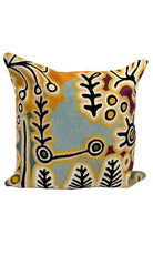 These beautiful, unique textiles are a cross -cultural collaboration combining Aboriginal designs and tradional Kashmiri handicraft. The chain-stitched (Gabba in local Kashmiri) cushions are hand stitched by