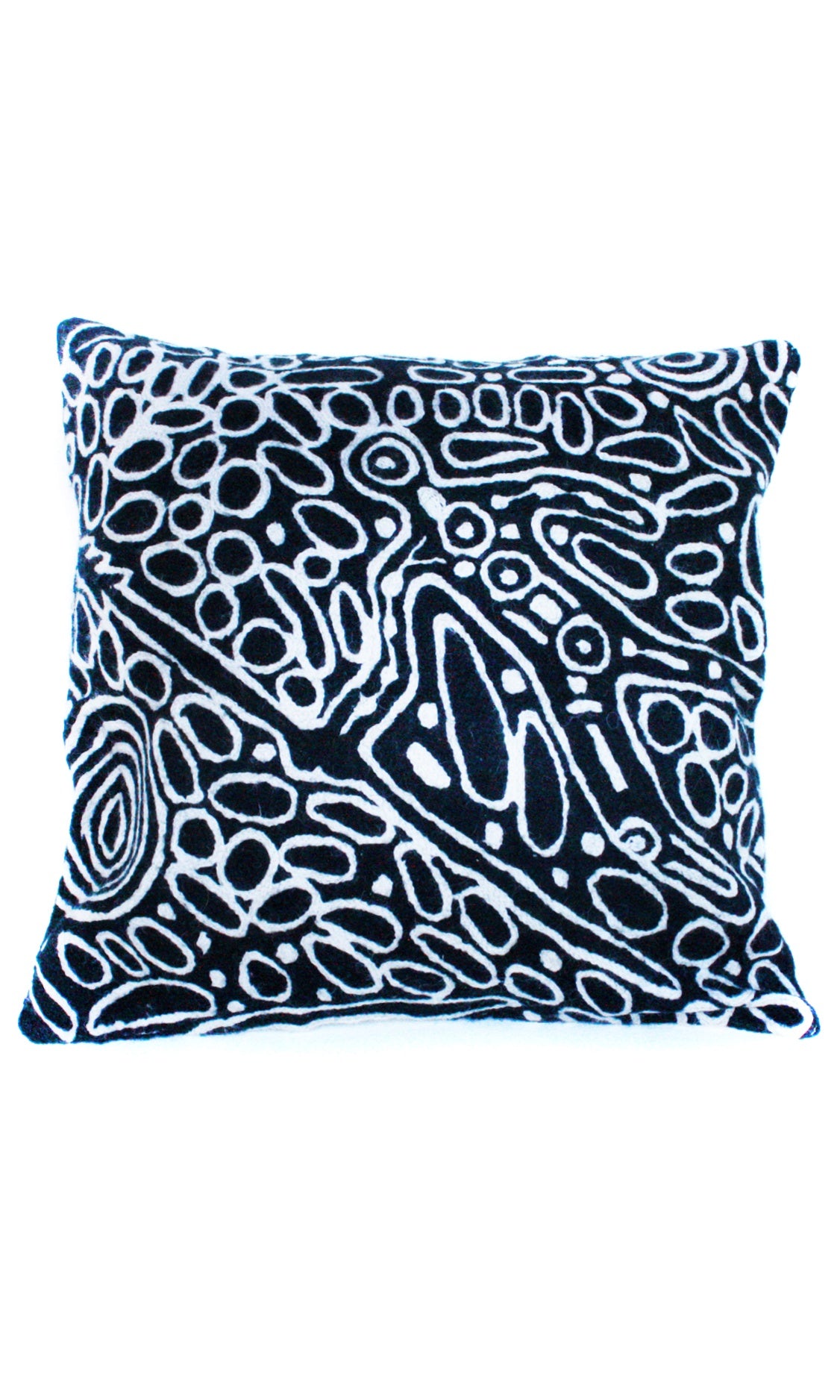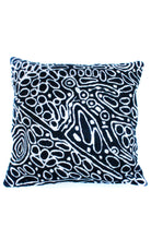 These beautiful, unique textiles are a cross -cultural collaboration combining Aboriginal designs and tradional Kashmiri handicraft. The chain-stitched (Gabba in local Kashmiri) cushions are hand stitched by