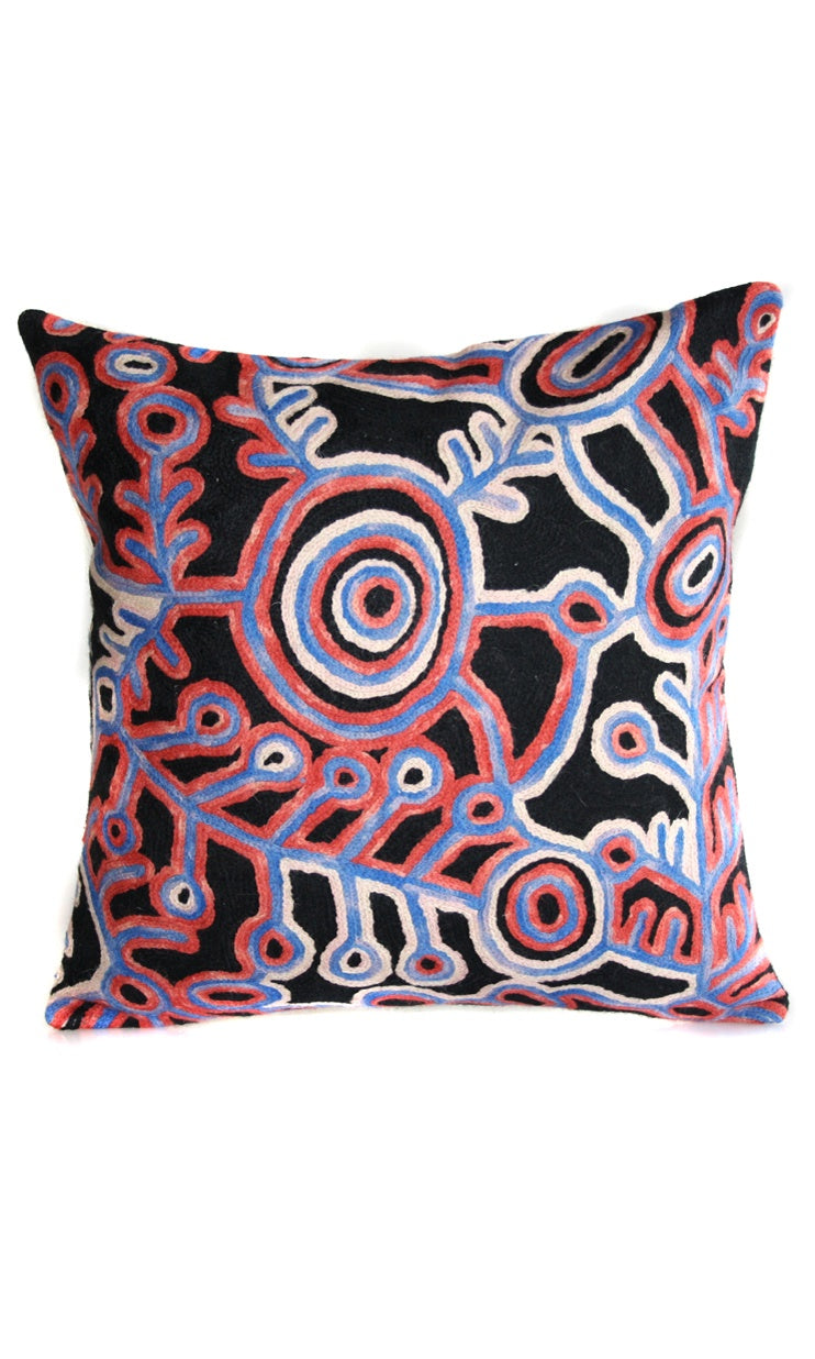 These beautiful, unique textiles are a cross -cultural collaboration combining Aboriginal designs and tradional Kashmiri handicraft. The chain-stitched (Gabba in local Kashmiri) cushions are hand stitched by