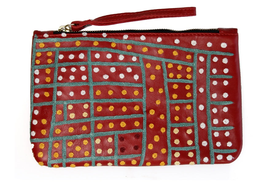 Aboriginal Art Embroidered Leather Clutch with Wrist Strap by Shorty Jangala Robertson
